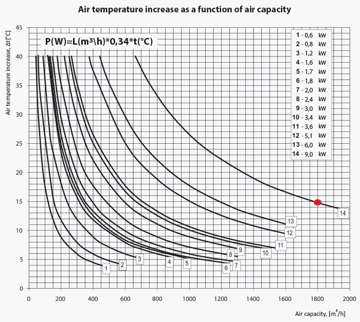 Príklad grafu: 9 kW ohrievač pri výkone 1800m3/h zvyšuje teplotu o 15° C. Takto si na grafe vieme pozrieť aký ohrev vieme urobiť pri určitých výkonoch.