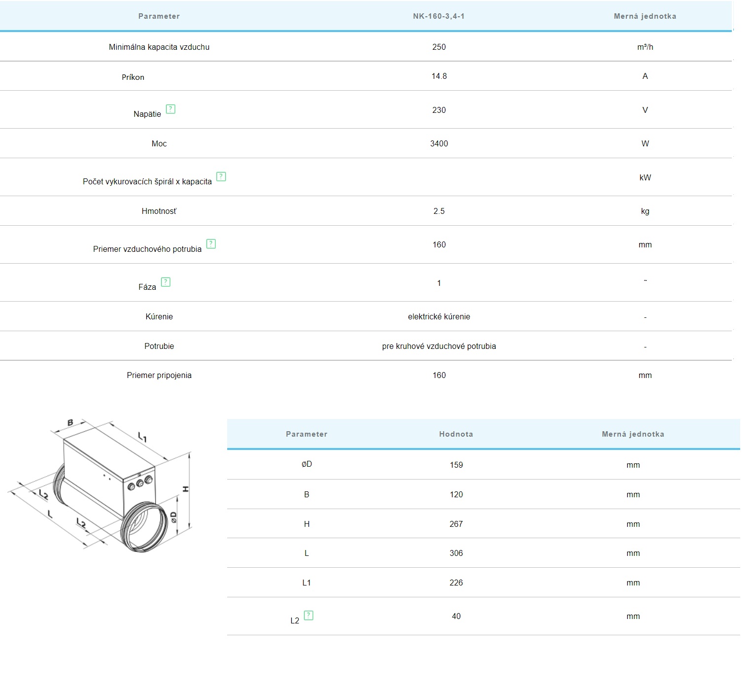 VENTS NK -160-3,4-1 Elektrický ohrievač 160mm 3,4kW 1fázový