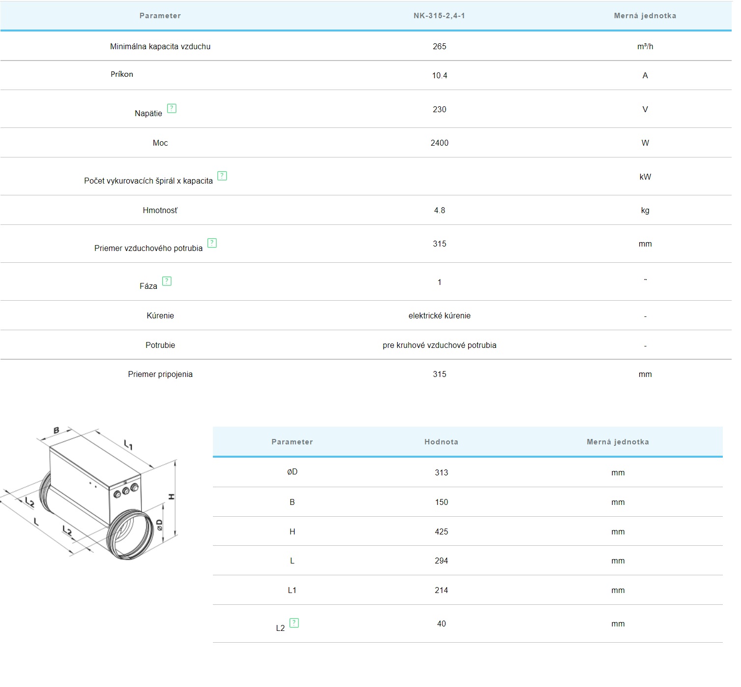 VENTS NK 315mm 2,4kW 1fázový elektrický ohrievač je určený na ohrev vzduchu v kruhových potrubiach. Používa sa vo vykurovacích a ventilačných systémoch.