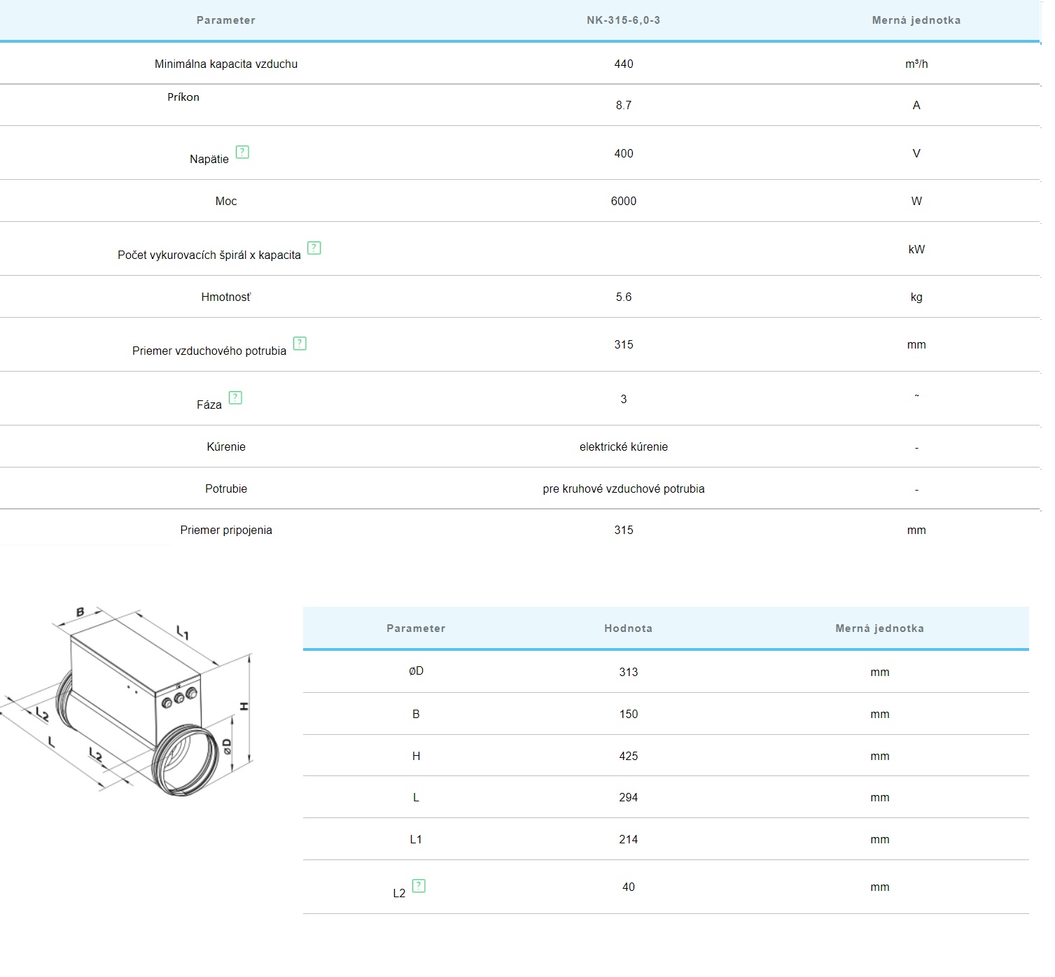 Potrubné elektrické ohrievače VENTS NK 315mm 6,0kW 3fázový 380V sú určené na ohrev privádzaného vzduchu v kruhovom potrubnom vetracom systéme. Ohrievače sa používajú vo vykurovacích, ventilačných a klimatizačných systémoch pre rôzne priestory. DIZAJN Puzdro a svorkovnica sú vyrobené z pozinkovanej ocele a vykurovacie telesá sú z nehrdzavejúcej ocele. Ohrievače sú vybavené gumovým tesnením pre pripojenie na vzduchové potrubie. Potrubné ohrievače VENTS NK sú vybavené dvoma termostatmi na ochranu proti prehriatiu: základná ochrana s automatickým reštartom s prevádzkovou teplotou +50 °C. Po ochladení termostat automaticky uzavrie riadiaci okruh ohrievača. Núdzová ochrana s manuálnym reštartom (prevádzková teplota +90 °C). V prípade odozvy je napájanie ohrievača povolené až po manuálnom núdzovom resete. Kontakty termostatu sú umiestnené vo svorkovnici pre externé pripojenie. Každá štandardná veľkosť má niekoľko možností elektrickej kapacity. Vyšší výkon je možné dosiahnuť sériovou inštaláciou ohrievačov. Všetky trojfázové ohrievače majú pripojenie do hviezdy. MONTÁŽ Konštrukcia ohrievača zabezpečuje jeho montáž na kruhové potrubie v ľubovoľnej polohe pomocou príchytiek. Smer prúdenia vzduchu sa musí zhodovať s ukazovateľom na filtri. Potrubné ohrievače môžu byť inštalované v akejkoľvek polohe s výnimkou elektrickej riadiacej jednotky nižšie, aby sa zabránilo prenikaniu kvapaliny a skratu vedenia. Montáž sa vykoná tak, aby sa umožnila rovnomerná distribúcia vzduchu po celom priereze. Vzduchový filter musí byť inštalovaný na vstupe ohrievača, aby chránil vykurovacie telesá pred znečistením. Minimálna vzdialenosť medzi ohrievačom a ostatnými prvkami systému nie je menšia ako dva spojovacie priemery. Potrubné ohrievače sú konštruované pre minimálnu rýchlosť prúdenia vzduchu 1,5 m/s a maximálnu prevádzkovú výstupnú teplotu 40 °C. V prípade možnosti regulácie otáčok zaistite minimálny prietok vzduchu ohrievačom. Ak ventilátor nebeží, je potrebné vypnúť napájanie ohrievača. Na zabezpečenie správnej a bezpečnej prevádzky ohrievača je možné použiť automatizačný systém na zabezpečenie komplexnej kontroly a ochrany: automatické riadenie kapacity vykurovacích telies a teploty ohrevu vzduchu; kontrola stavu filtra pomocou snímača diferenčného tlaku; vypnutie napájania v prípade vypnutia prívodného ventilátora alebo zníženia rýchlosti prúdenia vzduchu, ako aj v prípade činnosti zabudovaných termostatov prehriatia; vypnutie ventilačného systému s prefukovaním elektrických vykurovacích telies.