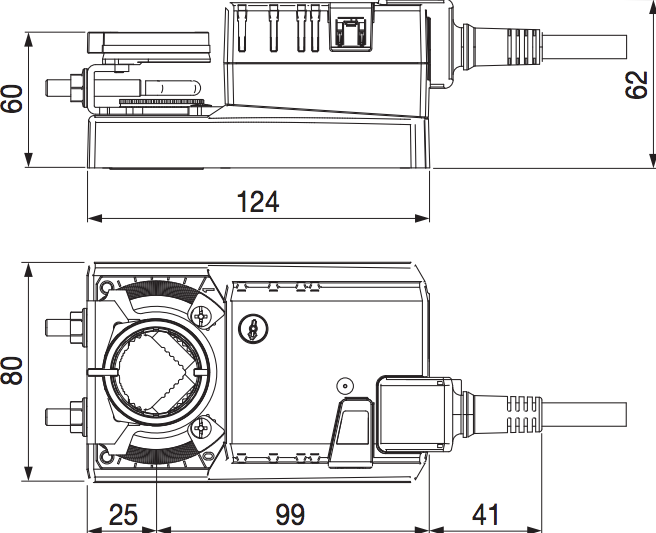 Klapkový pohon s krútiacim momentom 10 Nm, 240 V, maximálny uhol otočenia 95 °, mechanický koncový spínač, IP54.