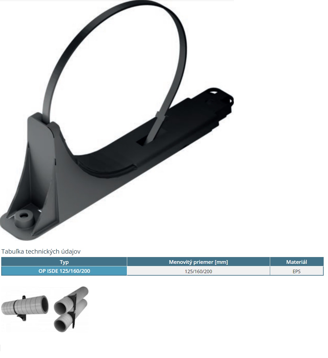 Nosná konzola pre izolované potrubie s rozmermi 125, 160 a 200 mm. Rýchla inštalácia a modulárny dizajn pre efektívne vedenie potrubí.