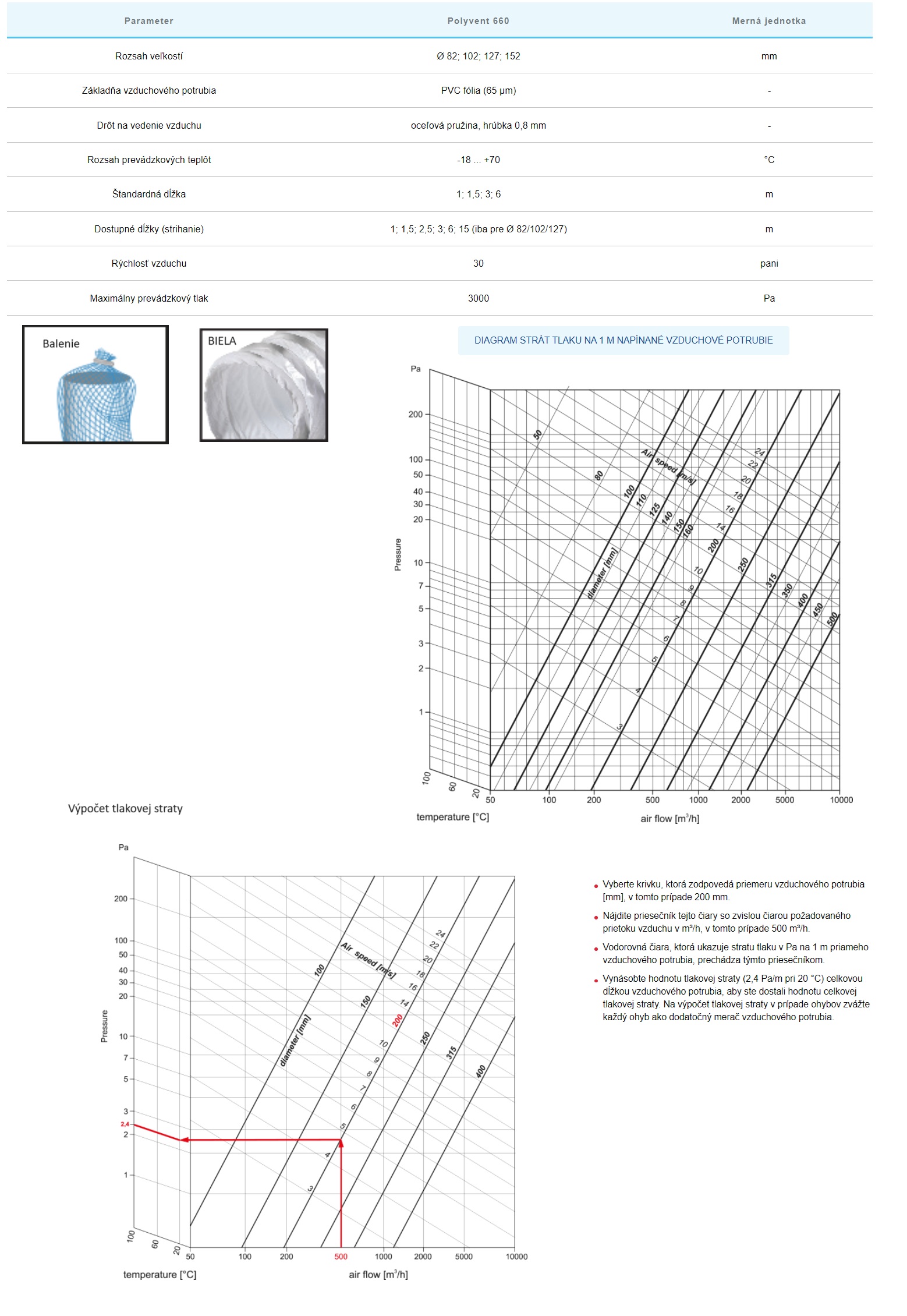 Flexibilné vzduchové potrubie z PVC so špirálovým rámom z oceľového drôtu s vysokým obsahom uhlíka. Vysoký kompresný pomer. Ťažko horľavý, spomaľujúci horenie, samozhášavý.