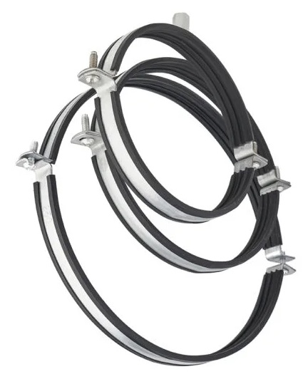 Vzduchotechnická spona OBMC držiak na potrubie z pozinkovanej ocele s gumovým tesnením pre potrubie Ø 250mm na zavesenie okrúhlych vzduchových potrubí.