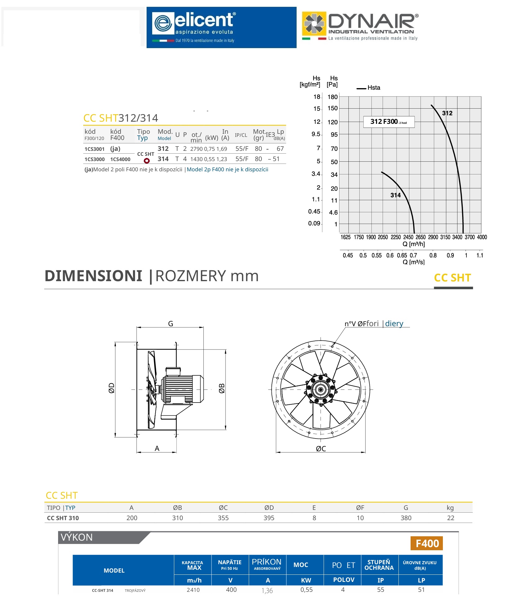 Odťahový ventilátor ELICENT DYNAIR-CC SHT 314 T4 F 400 °C-400V 4-polový s výkonom 2410 m³/h je vysokoúčinný potrubný axiálny ventilátor, určený pre vysokoteplotné odsávanie dymu. Ventilátory CC SHT sú špecificky dimenzované v štandardnom rozsahu, ktorý je vhodný pre výkonové triedy, ktoré sa bežne vyžadujú v pravidlách pre vetranie budov. Séria je vhodná na prevádzku pri teplote +60 °C a má CE certifikáciu F400 podľa EN 12101-3:2015.