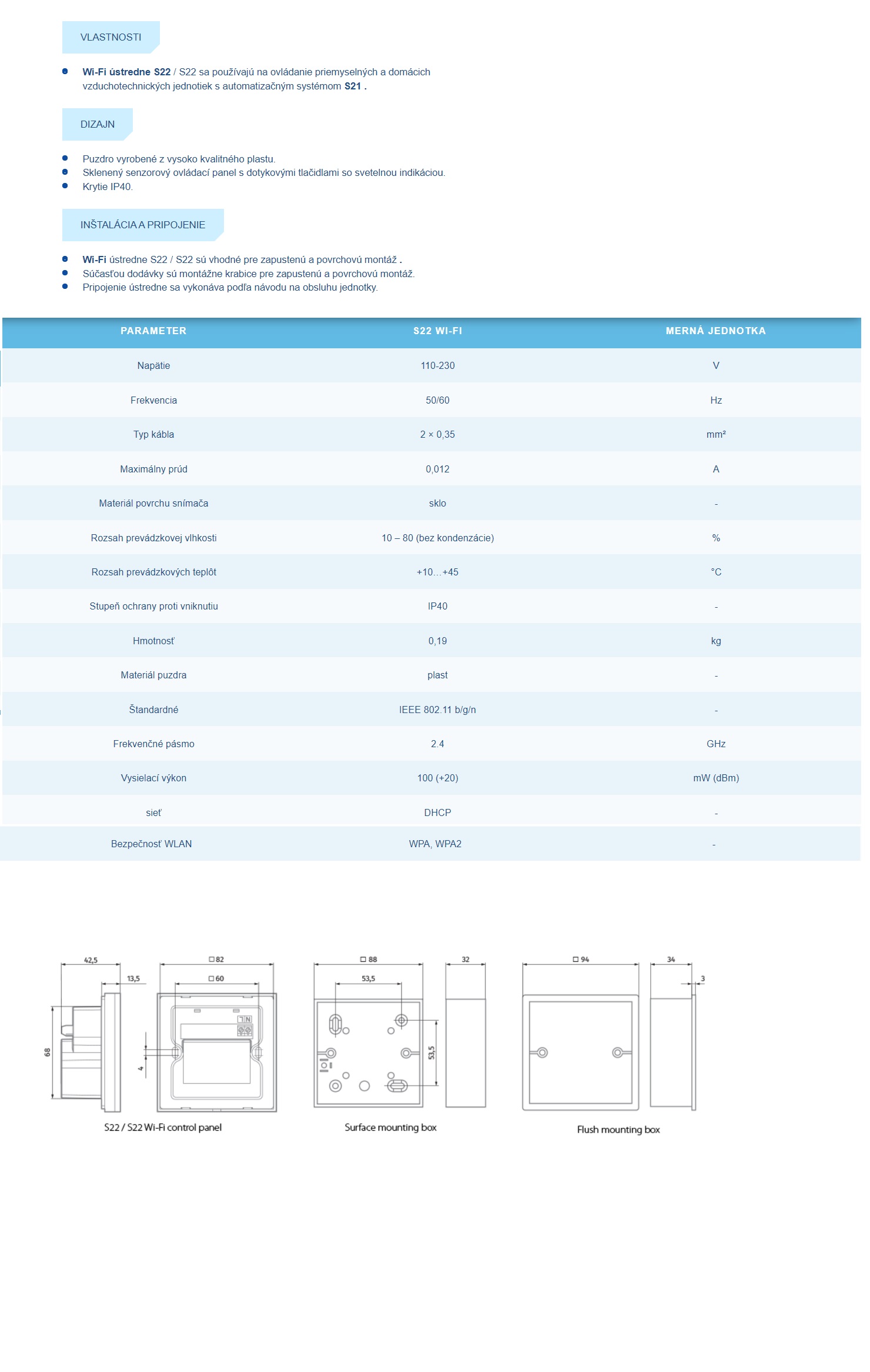 Ovládací panel Blauberg S22 WIFI je určený na ovládanie rekuperačných jednotiek s automatizačným systémom S21. Tento panel zabezpečuje jednoduché a efektívne riadenie prevádzky jednotiek.
