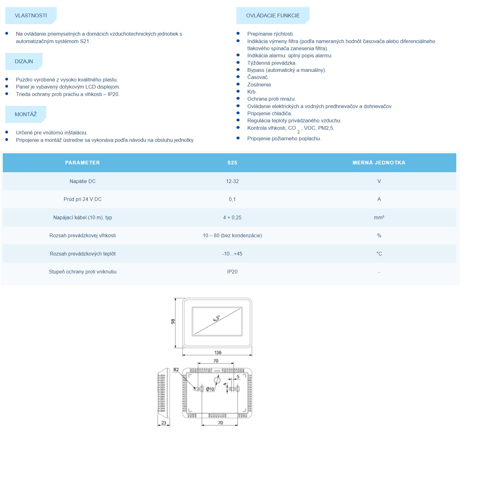 Ovládací panel S25 so senzorovým displejom slúži na ovládanie rekuperačných jednotiek s automatizačným systémom S21. Ak nechcete jednotku ovládať smartfónom, je možnosť dokúpiť si manuálne ovládanie.