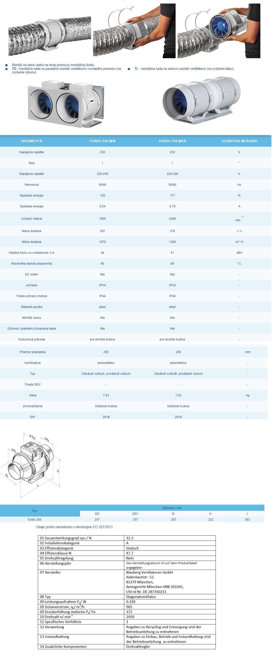 Poloradiálne potrubné priemyselné ventilátory Blauberg Turbo 250 s priemerom 250mm a dvojrýchlostným výkonom 1070-1360m3/h na napätie 230V sú určené pre systémy prívodu a odvodu vzduchu v rôznych miestnostiach.