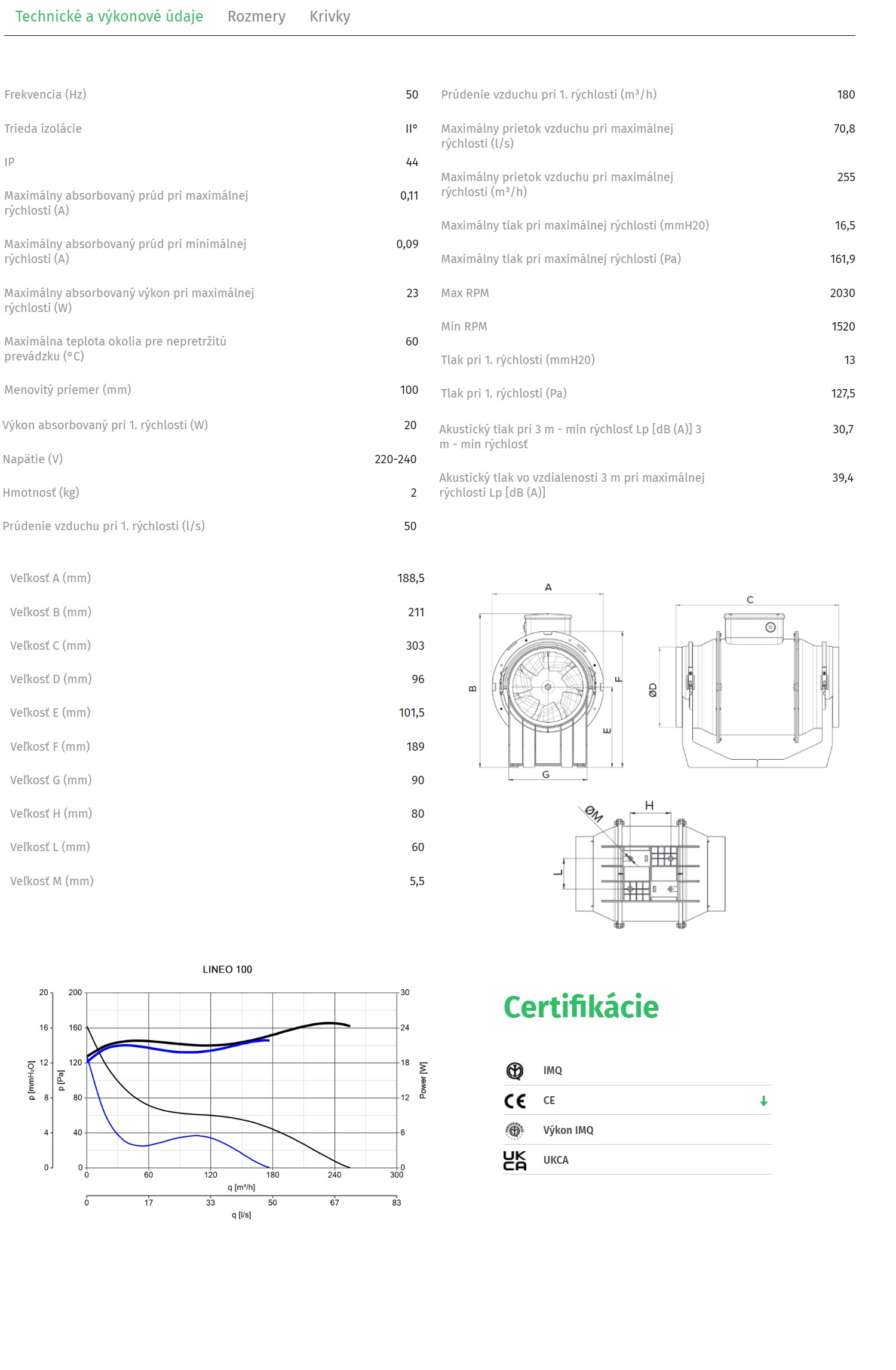 Potrubný ventilátor Vortice LINEO 125 – dvojrýchlostný, výkon 250-365 m³/h