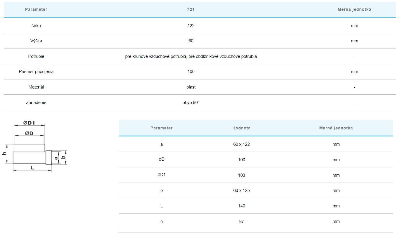 Vzduchotechnická plastová prechodka z hranatého potrubia 60x120mm na okrúhle potrubie Ø100mm. Určená pre priamu inštaláciu do vzduchového potrubia.