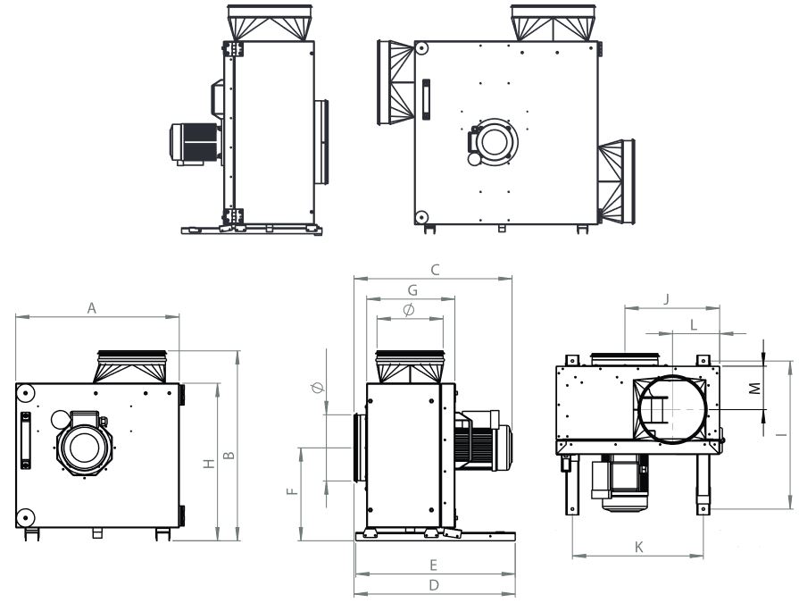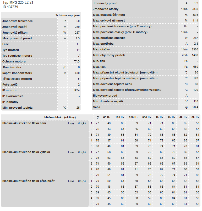 Elektrický motor: Ventilátor je vybavený spoľahlivým bezúdržbovým jednofázovým motorom s rotorom z vysoko kvalitnej ocele a obežným kolesom s dopredu zahnutými lopatkami. Motor má integrované tepelné kontakty pre pripojenie k externým ochranným zariadeniam. Obežné koleso je namontované na hriadeli motora a je vyvážené staticky a dynamicky. Motor má triedu vinutia Fa a krytie IP54 proti vniknutiu vody.