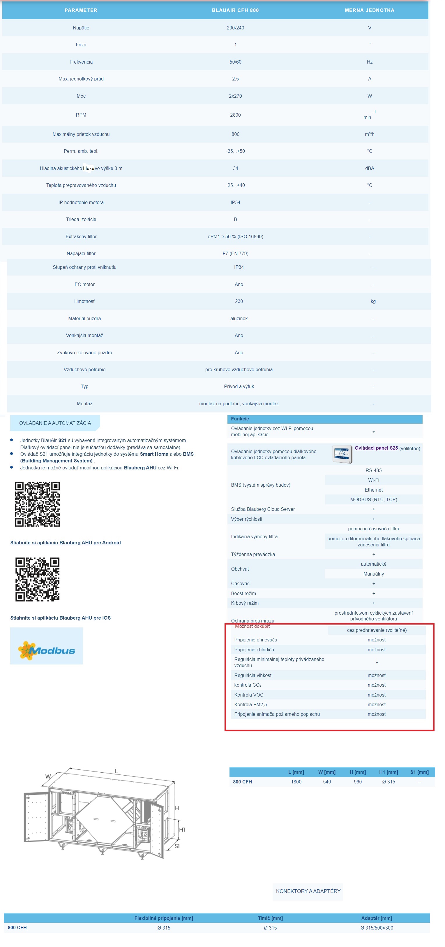 Voliteľná vonkajšia inštalácia s vonkajšou montážnou súpravou. Webové rozhranie, MODBUS, výstupy pre voliteľné DX alebo Hydronic chladenie/kúrenie.