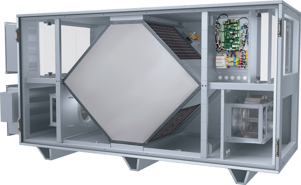 Vysokoúčinný protiprúdový výmenník tepla z profilovaných hliníkových platní s elastickým tepelne odolným tmelom. Odtoková vaňa z nehrdzavejúcej ocele na prívodnej aj výfukovej strane.