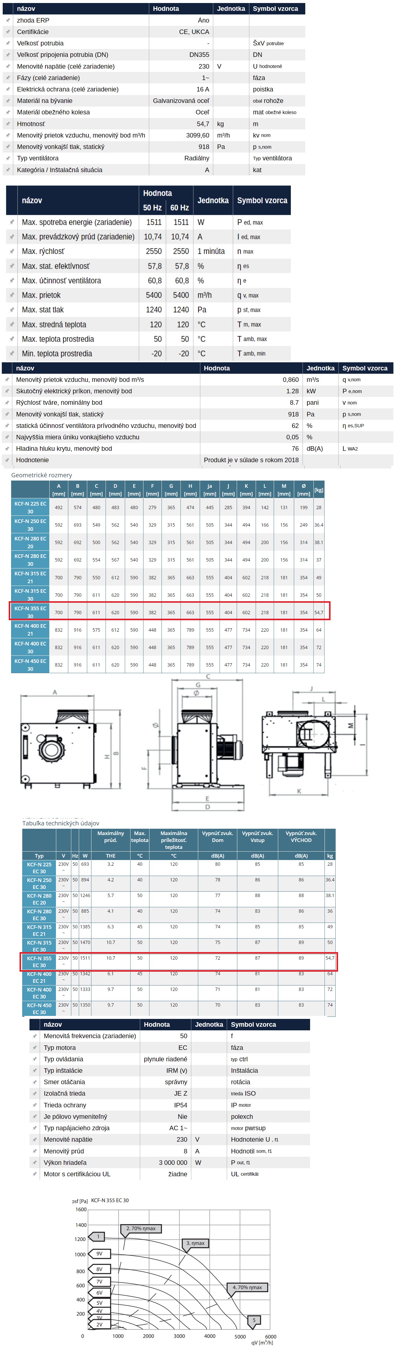 Kuchynský ventilátor KCF-N 355EC s jednostranným saním, EC motorom a reguláciou 0-10V. Určený pre veľké kuchynské digestory, dvojplášťový dom s izoláciou.