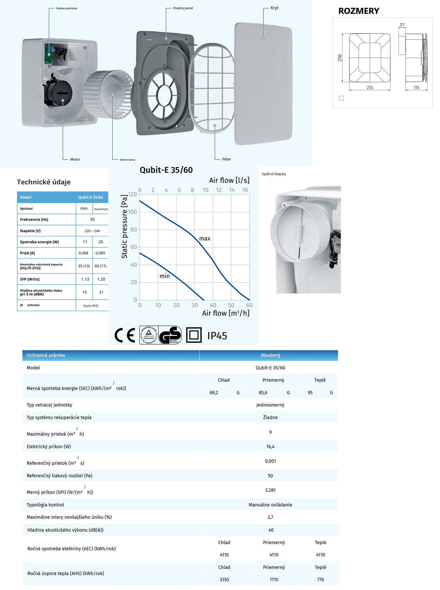- Vlastnosti-výbava ventilátora : Gulôčkové ložisko-vhodná do stropu aj na stenu, Parový /vlhkostný/senzor má automaticky časový dobeh, Spätná klapka