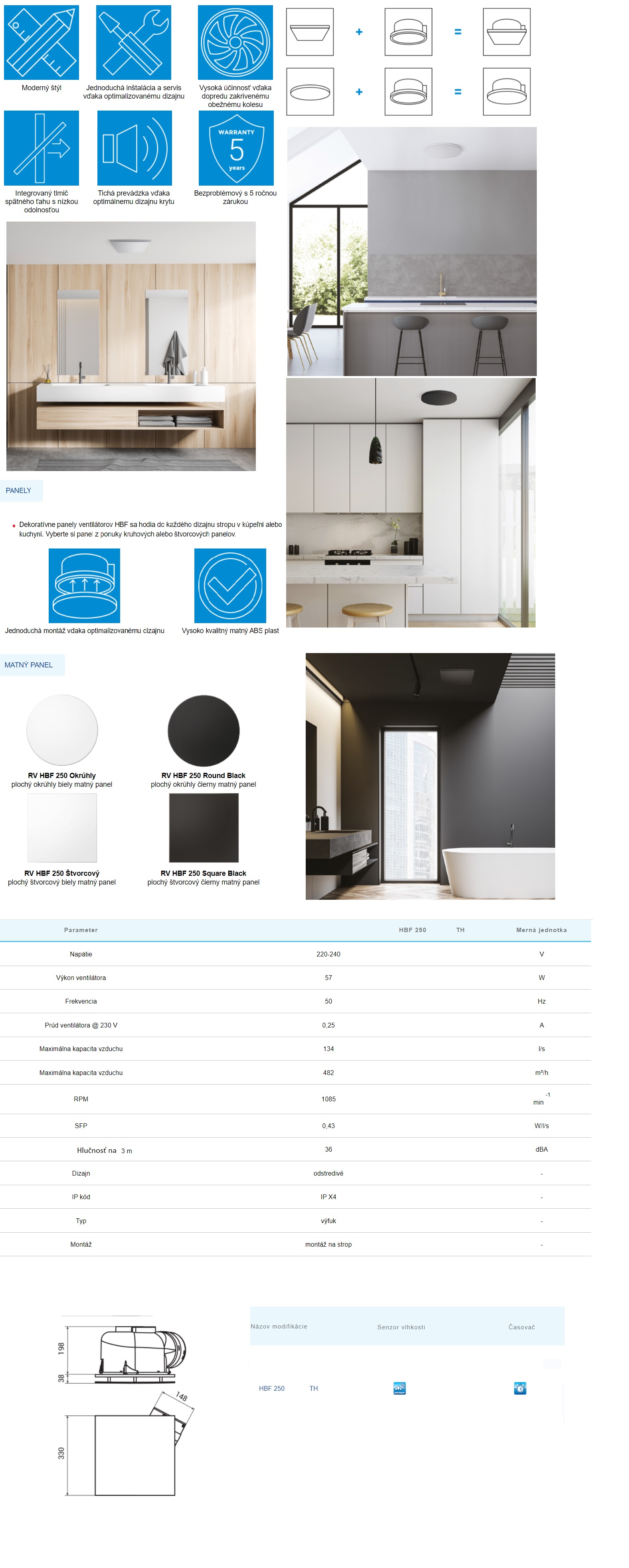 Radiálny ventilátor VENTS HBF 250TH s výkonom 482 m³/h a senzorom vlhkosti je súčasťou dizajnovej série stropných zápustných ventilátorov od spoločnosti VENTS, svetového lídra v oblasti vetrania domácností. Rôzne univerzálne dekoratívne panely, vysoká kvalita ventilátorov VENTS a možnosť stropnej montáže sú prednosťami tejto série. HBF 250TH je najvýkonnejší a najtichší ventilátor pre stropné výfukové systémy. So vzduchovým výkonom až 482 m³/h patrí medzi top ventilátory na trhu.