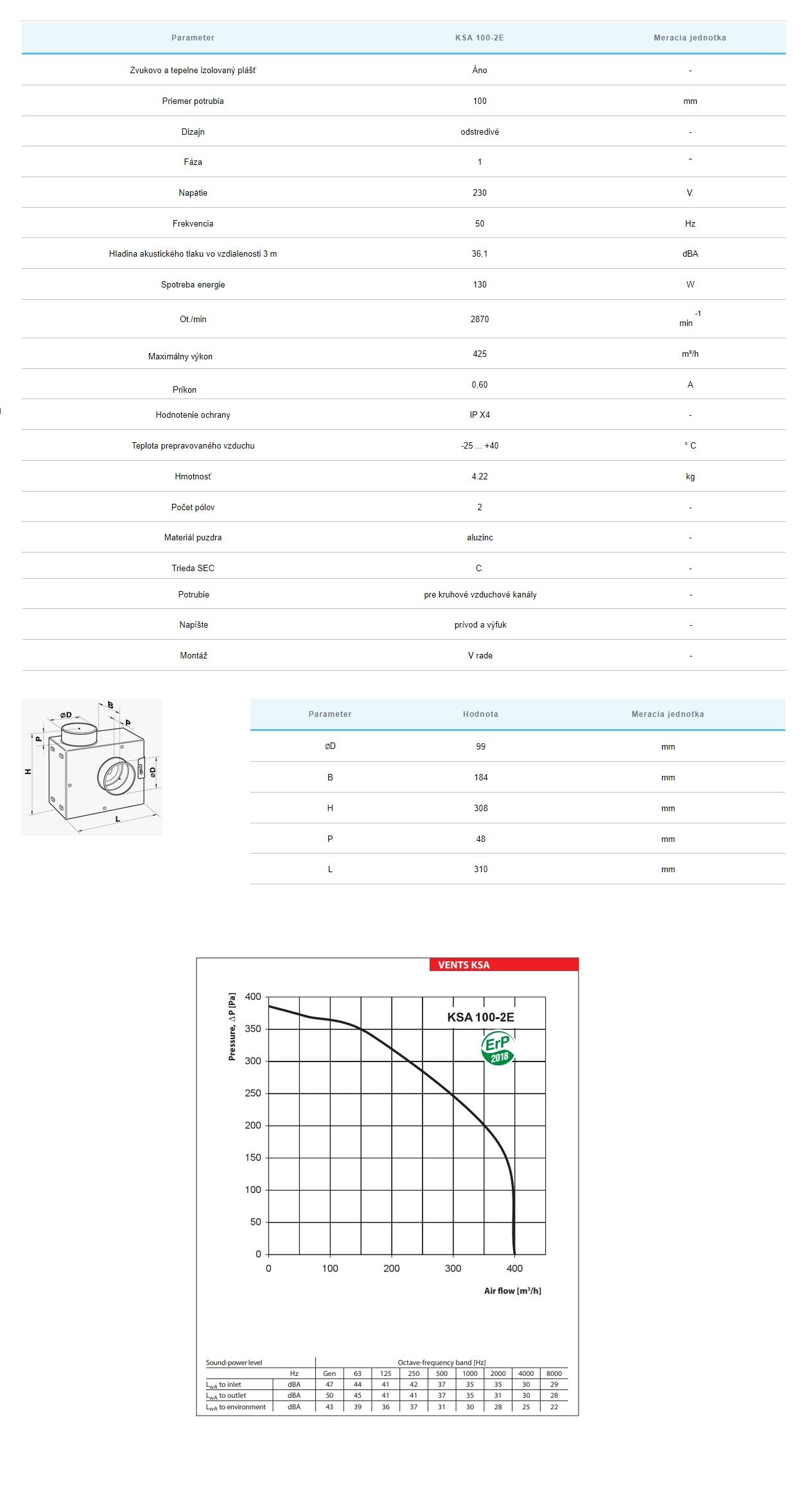 Radiálny ventilátor VENTS KSA 100-2E s priemerom 100 mm a výkonom 425 m3/h. Tento nízkohlukový ventilátor je určený na umiestnenie do podhľadov a iných málo prístupných priestorov. Kryt ventilátora je vyrobený z Aluzinkového plechu, čo zaručuje jeho odolnosť a dlhú životnosť. Tepelne a zvukovo izolačná vrstva je z penového polystyrénu, čo prispieva k tichému chodu. Obažné koleso je vyrobené z pozinkovanej ocele s dopredu zahnutými lopatkami a je poháňané 2 pólovým asynchrónnym motorom s vonkajším rotorom. Motor je vybavený guličkovými ložiskami pre dlhšiu životnosť a každé obežné koleso je dynamicky vyvážené pre presnú funkčnosť a bezpečnú prevádzku. Krytie motora je IP 44.