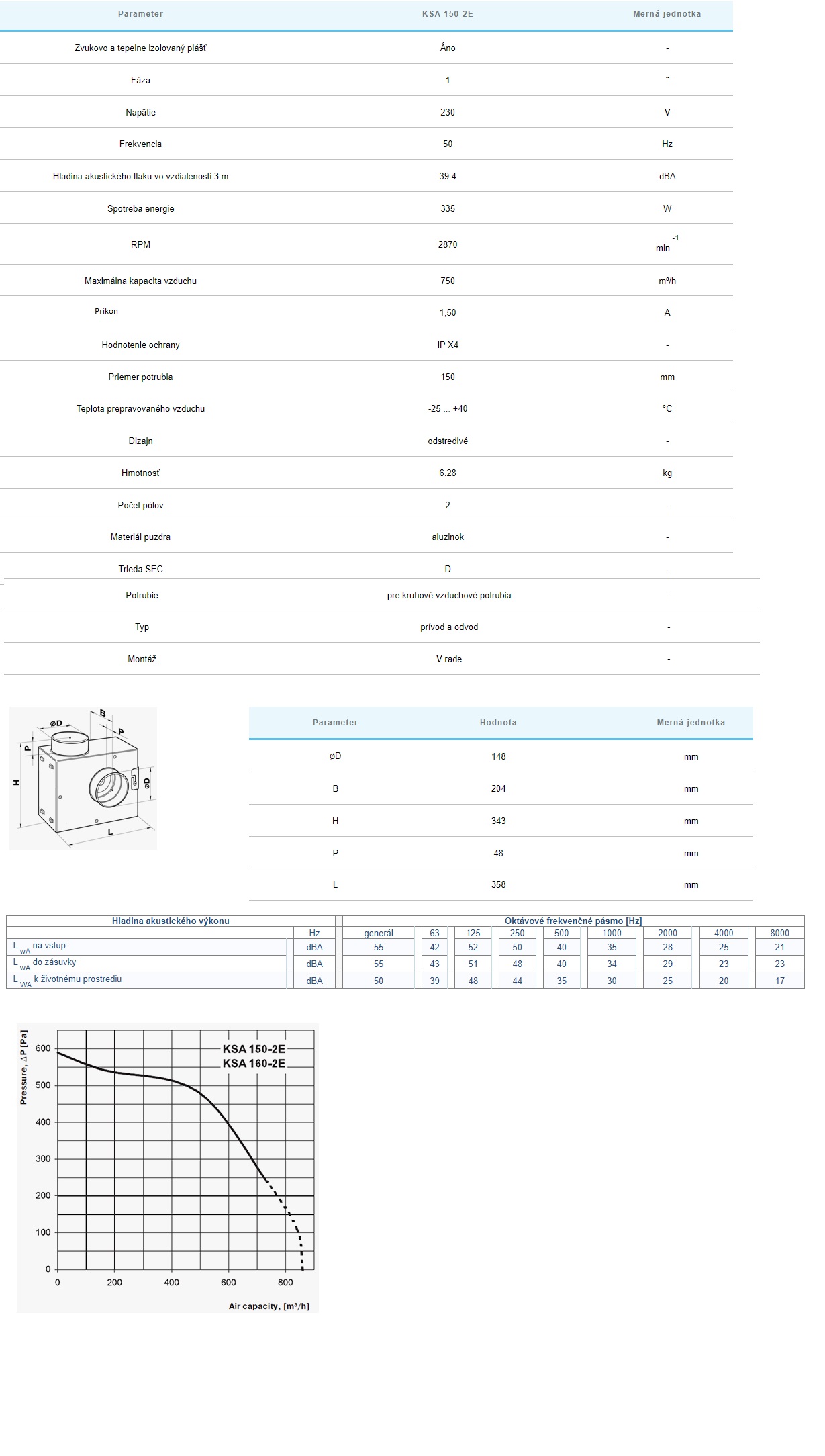 Radiálny ventilátor VENTS KSA 150-2E s výkonom 750 m³/h. Kryt ventilátora je vyrobený z Aluzinkového plechu. Tepelne a zvukovo izolačná vrstva je vyrobená z penového polystyrénu. Obežné koleso je vyrobené z pozinkovanej ocele a dopredu zahnutými lopatkami, je poháňaný pomocou 2 pólového asynchrónneho motoru s vonkajším rotorom. Motor je vybavený guličkovými ložiskami pre dlhšiu životnosť. Pre presnú funkčnosť a bezpečnú prevádzku je každé obežné koleso dynamicky vyvážené. Motor má krytie IP 44.2
