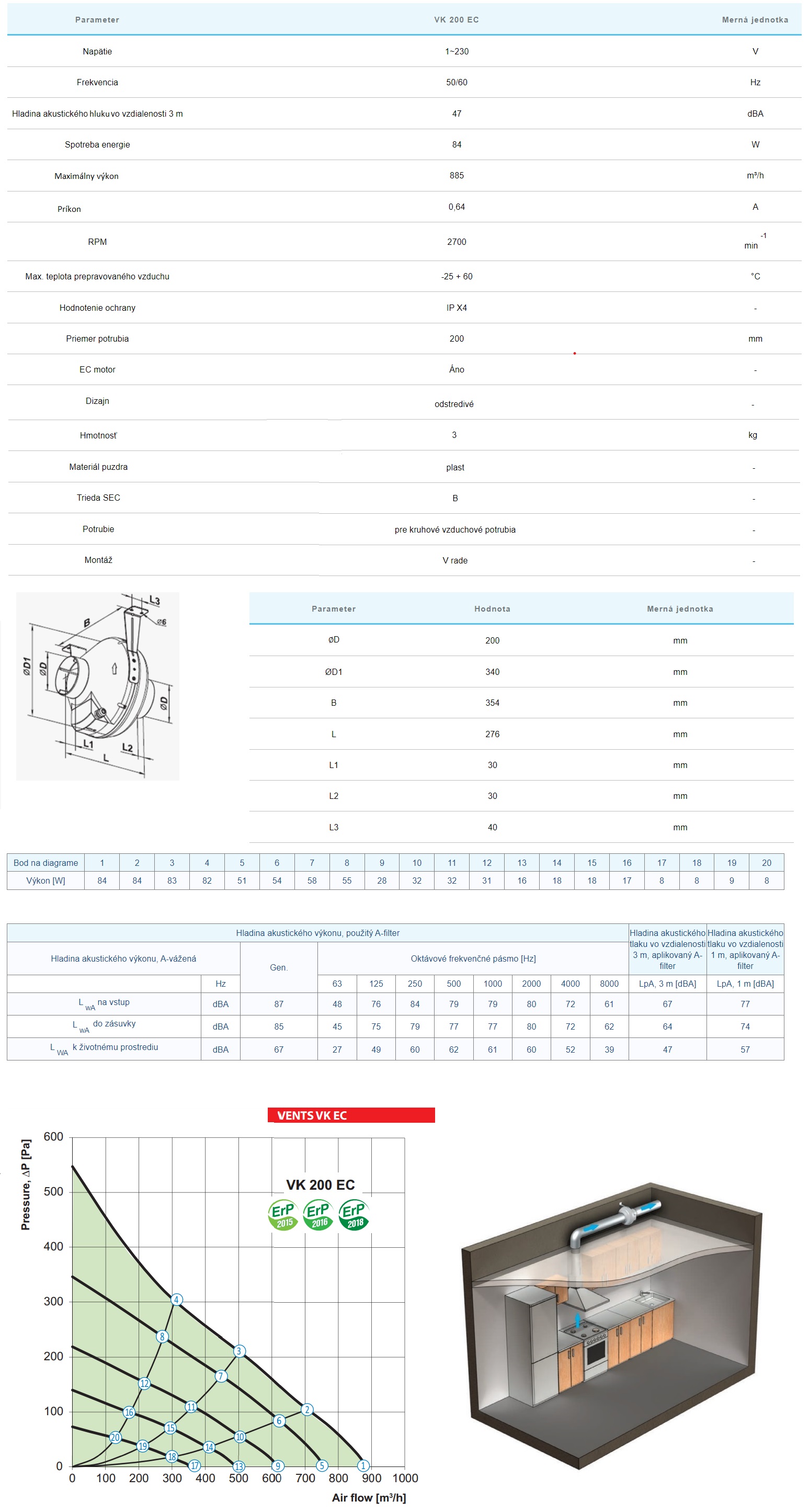 Radiálny ventilátor VENTS VK 200 EC s priemerom 200 mm a výkonom 885 m3/h, napätie 230 V, je určený pre systémy zásobovania a odsávania vzduchu v obchodných, kancelárskych a ďalších priestoroch. Tento ventilátor je navrhnutý pre okrúhle vzduchovody a je dodávaný s tichým motorom, ktorý má nízku hladinu hluku. Vzhľadom na odolnosť plastového krytu, je ideálnym riešením pre inštaláciu vo vzduchotechnických systémoch vetrania vo vlhkých priestoroch, ako sú kúpeľne, kuchyne a podobne. Kryt je vyrobený z vysoko kvalitného odolného plastu ABS a ventilátory sú vybavené vodotesnými svorkovnicami. Dynamicky vyvážené obežné koleso s dozadu zahnutými lopatkami je vyvážené v dvoch rovinách.