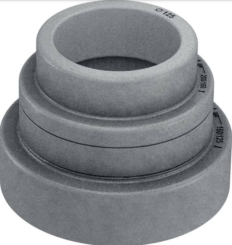 Trojstupňová redukcia OP 125-160-200mm, ktorá umožňuje zmenu priemeru potrubia medzi NA125, 160 alebo 200 mm. Nadbytočný priemer sa musí odrezať.
