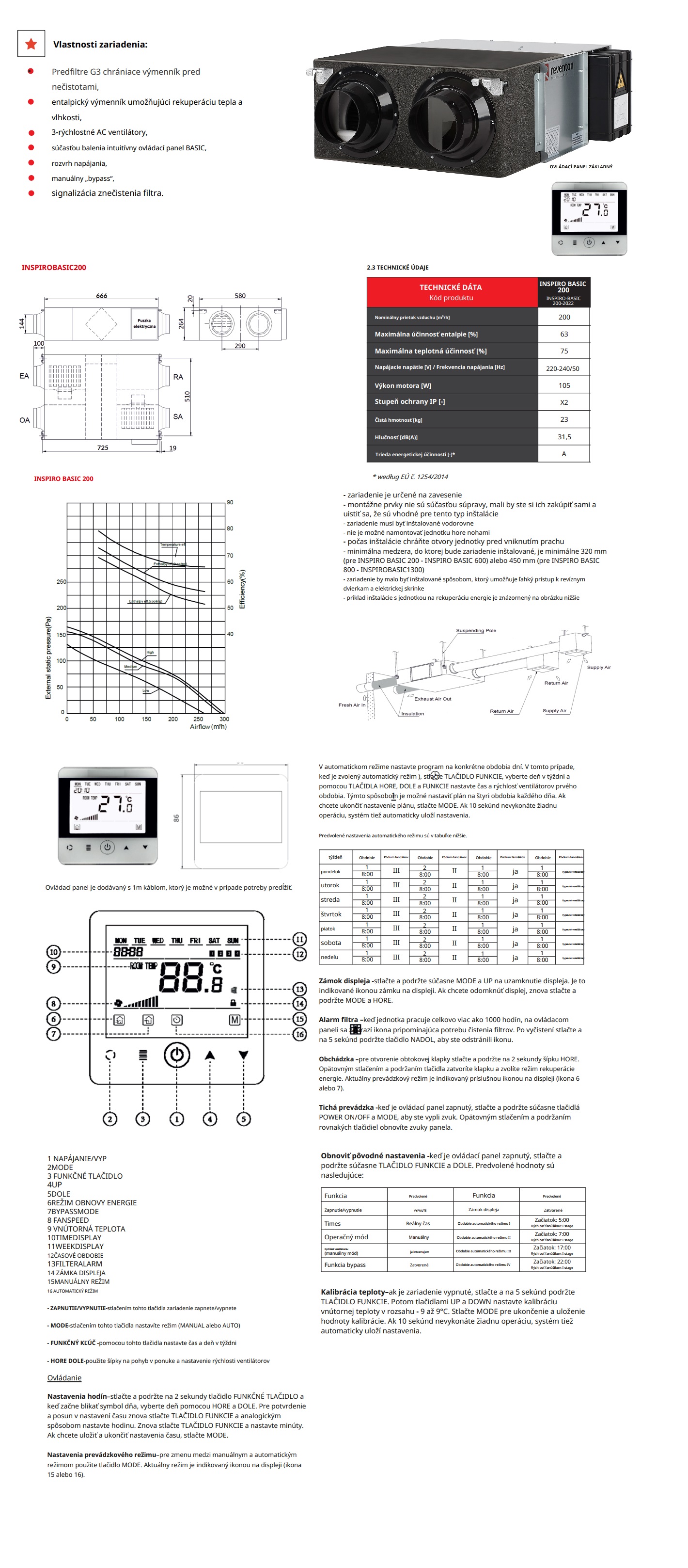 Rekuperačné jednotky INSPIRO BASIC 200 s entalpickým výmenníkom sú určené do vetracích systémov ako moderný prvok umožňujúci spätné získavanie energie – tepla a vlhkosti. Je určený na vetranie obytných budov: rodinných a viacgeneračných domov. Rekuperácia energie umožňuje výrazné zníženie nákladov na prevádzku budovy. Dodatočné zvlhčovanie / odvlhčovanie vzduchu privádzaného do miestnosti má na starosti entalpický výmenník umiestnený v zariadení. Takéto technologické riešenie znamená, že nie je potrebné inštalovať systém odvodu kondenzátu a minimalizuje riziko mrazu. 3-rýchlostné AC ventilátory zodpovedné za prívod a odvod vzduchu zaisťujú plynulú výmenu použitého vzduchu za čerstvý. Použité predfiltre G3 chránia výmenník pred rýchlym znečistením. Komunikácia a ovládanie zariadenia prebieha cez ovládací panel.