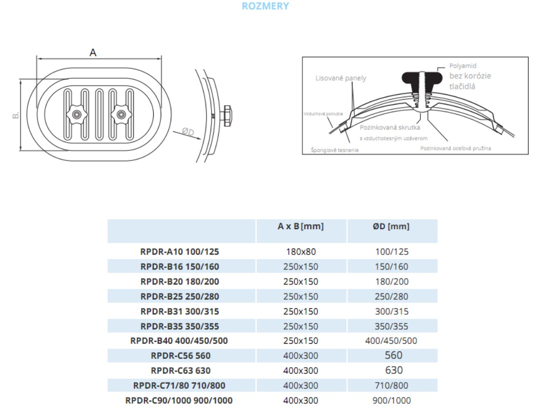 Revízne dvierka RPD-B16 pre spiro potrubie sú zakrivené a určené pre potrubie kruhového prierezu. Vyrobené z pozinkovanej ocele, s izoláciou pre vzduchotesnú konštrukciu na vnútornom povrchu. Pružina medzi dvoma stranami montážnych dverí zabezpečuje pevné spojenie. Tlak pretlaku vzduchu dosahuje až 2000 Pa, zníženie tlaku: až 750 Pa. Oválne revízne dvierka sú vybavené pružinovým tlačidlom a vzduchotesným uzatváraním vďaka neoprénovému tesneniu uzavretých buniek, čím spĺňajú normy HVCA DW 44 pre vzduchotesnosť.