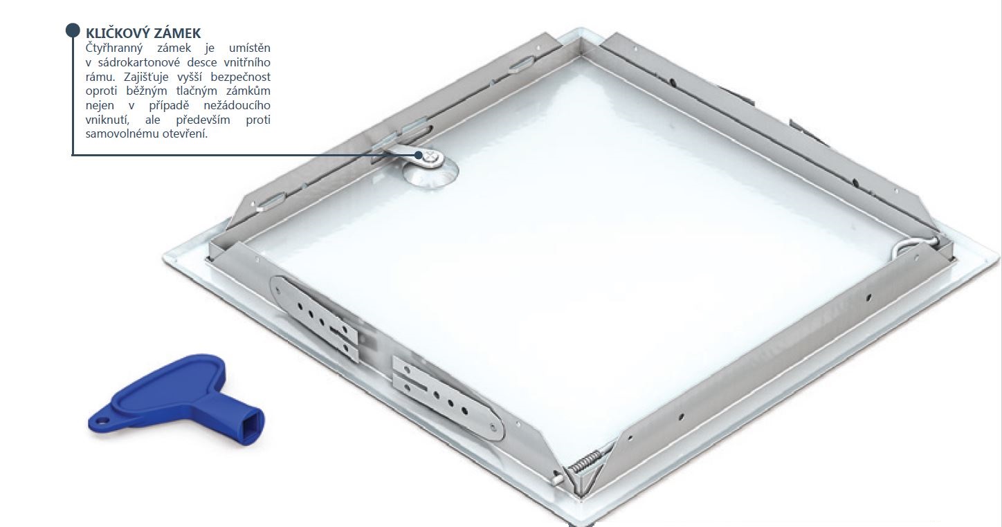 Otváranie a zatváranie umožňuje plastový štvorhranný kľúč, ktorý sa vloží do otvoru na vnútornom ráme a otočením odistí či zaistí západku. Kľúč je súčasťou balenia. Revízne dvierka sú balené do priehľadnej fólie po jednom kuse.