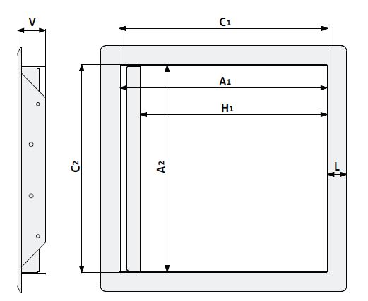 Kovové revízne dvierka H 400x400mm sú vyrábané lisovaním z oceľového plechu. Tvorí ich vonkajší rám, ktorý pomocou lemu zakrýva nerovnosti montážneho otvoru, a otvárateľný vnútorný rám spojený odnímateľným pántom. Povrchová úprava je biela a dvierka sú lakované komaxitom, ktorý zaisťuje antikoróznu ochranu.