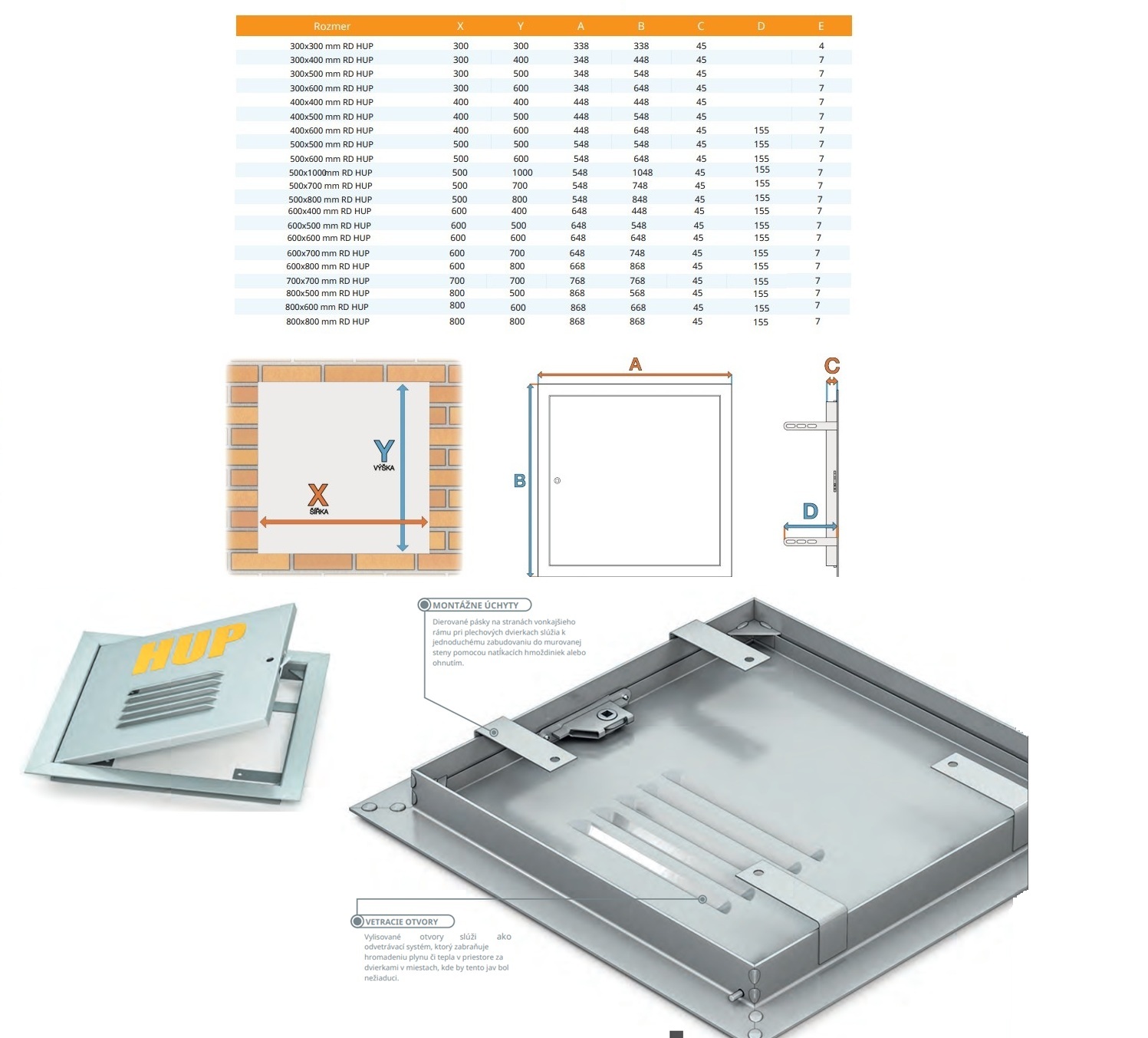 Kovové revízne dvierka HUP 400×400 s odvetraním z pozinkovaného plechu. Uzatváranie na univerzálny štvorhran, kľučka a samolepka HUP sú súčasťou balenia. Farba: biela (RAL 9010), hrúbka plechu 1,0 mm, hĺbka zárubne 45 mm. Rám a dvierka sú spojené nitmi, ktoré slúžia ako pánty.