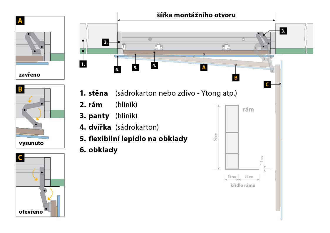 Revízne dvierka pod obklady slúžia na zakrytie revíznych otvorov v stenách, kde je požiadavka na finálne dokončenie s nalepeným keramickým obkladom. Montujú sa na miestach, kde je potrebný prístup k revízii alebo inštaláciám. Sú určené na zabudovanie do sadrokartónových systémov alebo do plného muriva (systém YTONG a podobne). Vonkajší rám sa upevňuje vo stavebnom otvore pomocou príslušných spojovacích prvkov a otváracia sadrokartónová doska, uchytená na pántoch z Al zliatiny, umožňuje prístup k rozvodom za stavebnými konštrukciami. Po zabudovaní sú dvierka obložené keramickým obkladom. Revízne dvierka nie sú určené pre oddeľovanie požiarnych úsekov ani únikových ciest.