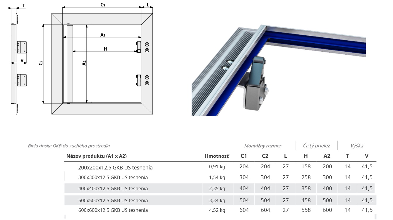 Dvierka sú vyrobené zo špeciálnych hliníkových profilov, ktoré sú zvárané do vonkajšieho a vnútorného rámu. Kompletná zostava je spojená pomocou pevného pántu a umožňuje tak otváranie krídla dvierok v prípade potreby. Vnútorný rám dvierok je osadený gumovým tesnením, ktoré zabraňuje priechodu vzduchu. Tento model sa vyrába s bielou doskou, upevnenou do vnútorného rámu pomocou vysokopevnostného lepidla, čo zaručuje rýchlu a nenáročnú povrchovú úpravu. Na prianie zákazníka je možné dosku pripevniť pomocou samovrtných skrutiek.