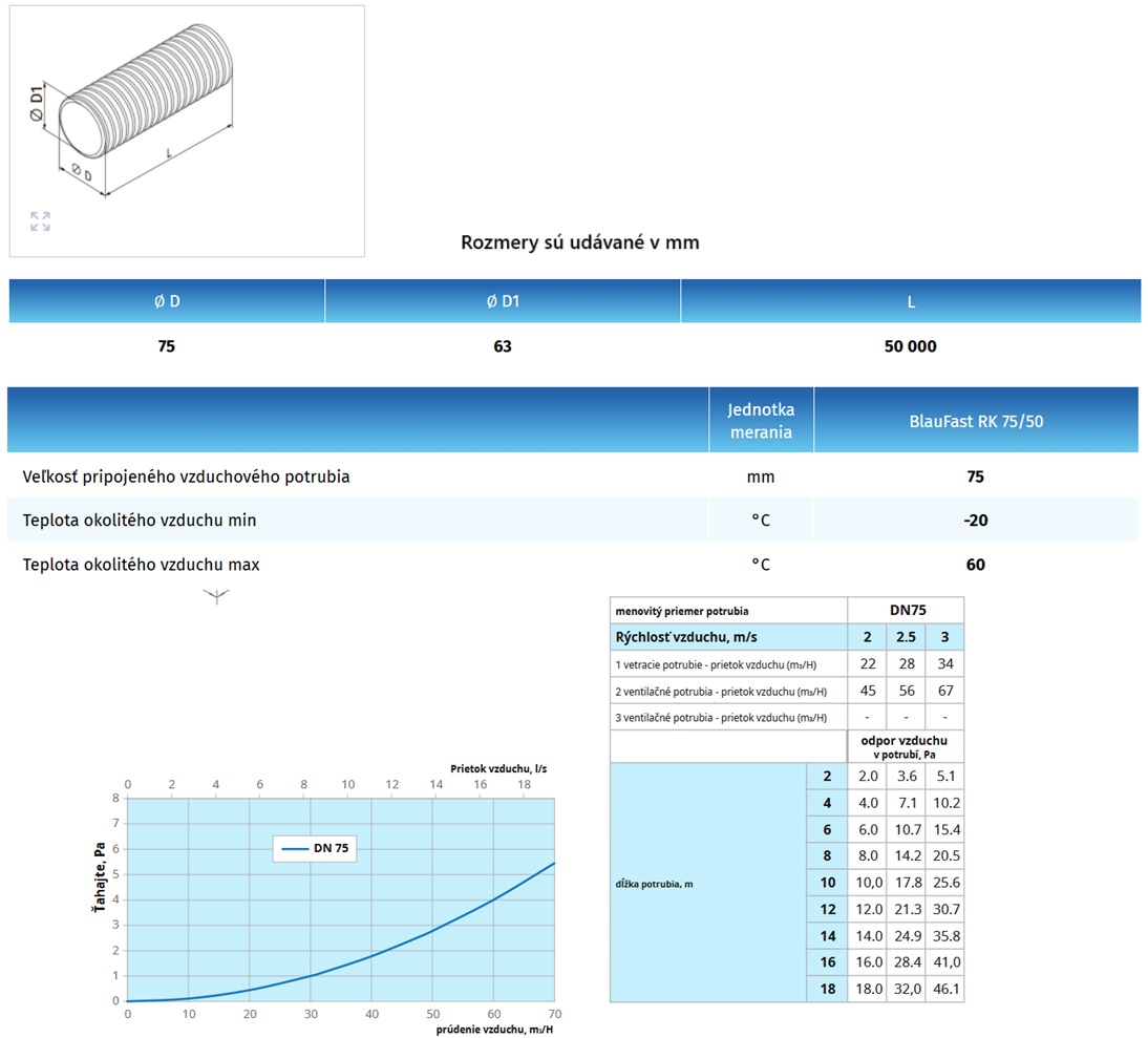 Blauberg Blaufast 75mm hadica na rekuperáciu s priemerom 63mm
