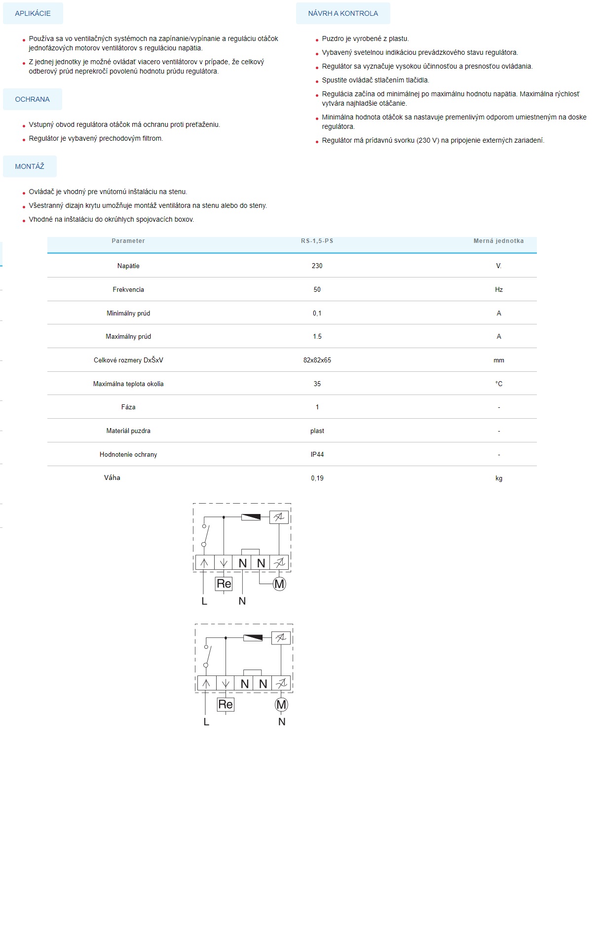 Tyristorový regulátor otáčok RS-1,5-PS je nástenný regulátor pre 230 Voltové zariadenia s maximálnym prúdom 1,5 Ampéru. Vyznačuje sa vysokou účinnosťou a presnosťou regulácie. Ovládanie sa vykonáva pomocou gombíka, pričom prechod do maximálnej rýchlosti je jednoduchý a intuitívny. Minimálna rýchlosť sa nastavuje pomocou potenciometra na DPS. Prepínanie sa vykonáva stlačením ovládacieho gombíka.