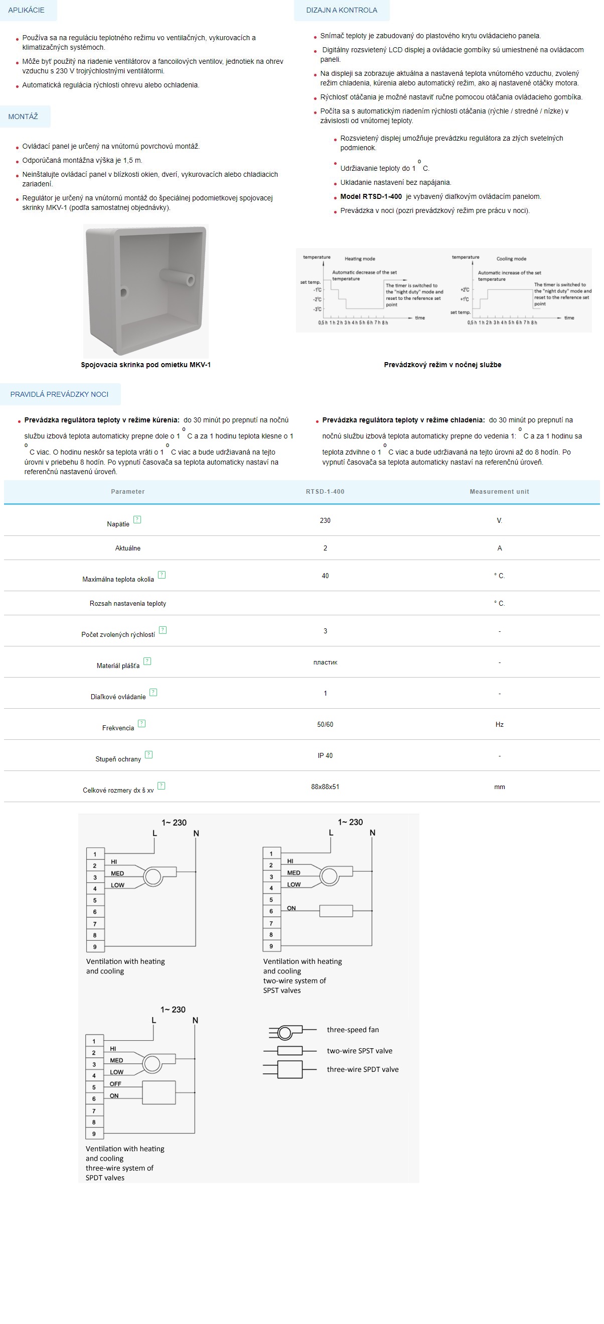 Termostat regulátor teploty RTSD-1-400 je vstavaný do plastového krytu ovládacieho panelu a je vybavený diaľkovým ovládačom pre pohodlné nastavenie.