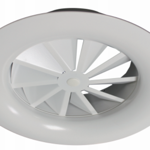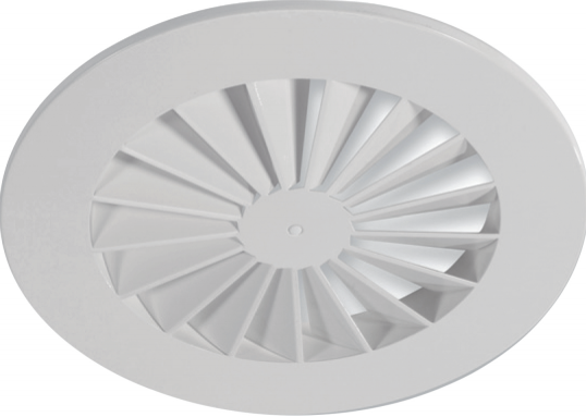 Okrúhly stropný anemostat s pevnými lamelami. Materiál: oceľ, farba: biela, RAL 9016. Použitie: prívod a odvod vzduchu vo ventilačných systémoch.