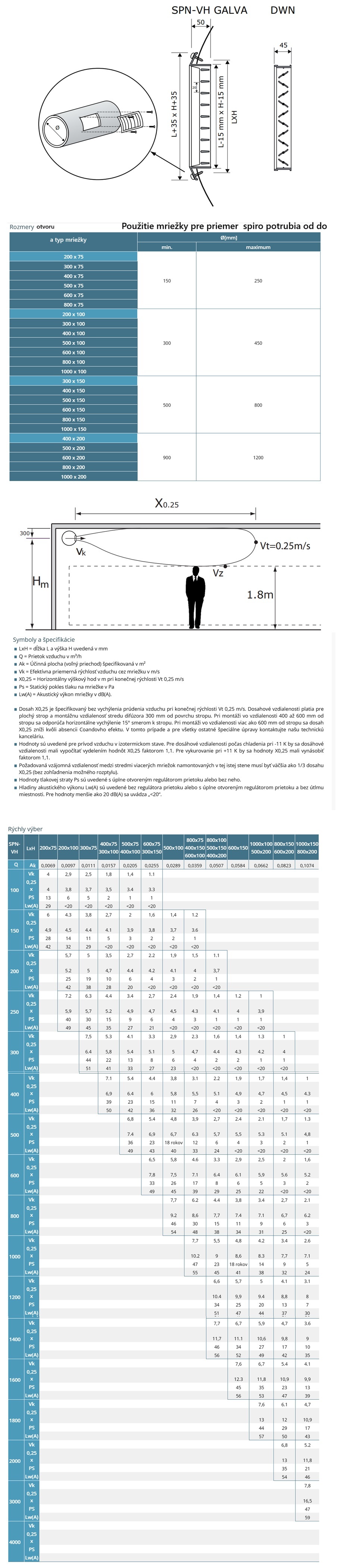 Dvojradová vetracia mriežka SPN-VH GALVA s nastavitelnými lamelami v naturnej farbe je určená na prívod a odvod vzduchu. Pre rovnomernú distribúciu vzduchu cez celú výustku je vhodné použiť niektorú z regulácií alebo pretlakových komôr. Táto mriežka je špeciálne navrhnutá pre spiro potrubia.