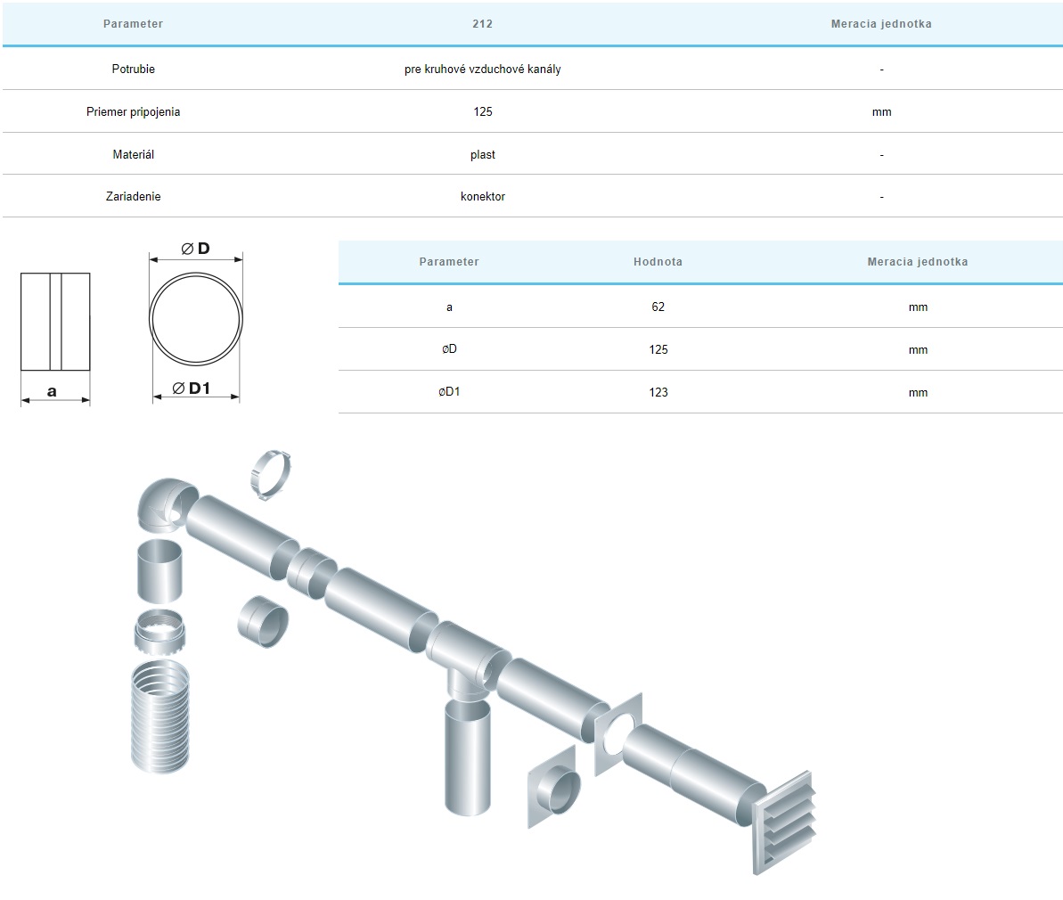 Plastová spojka kód 212 pre potrubie Ø125mm slúži na pripojenie vzduchových potrubí rovnakého priemeru. Spojka sa vsúva do potrubia Ø125mm a zabezpečuje efektívne napájanie a odsávanie vzduchu.