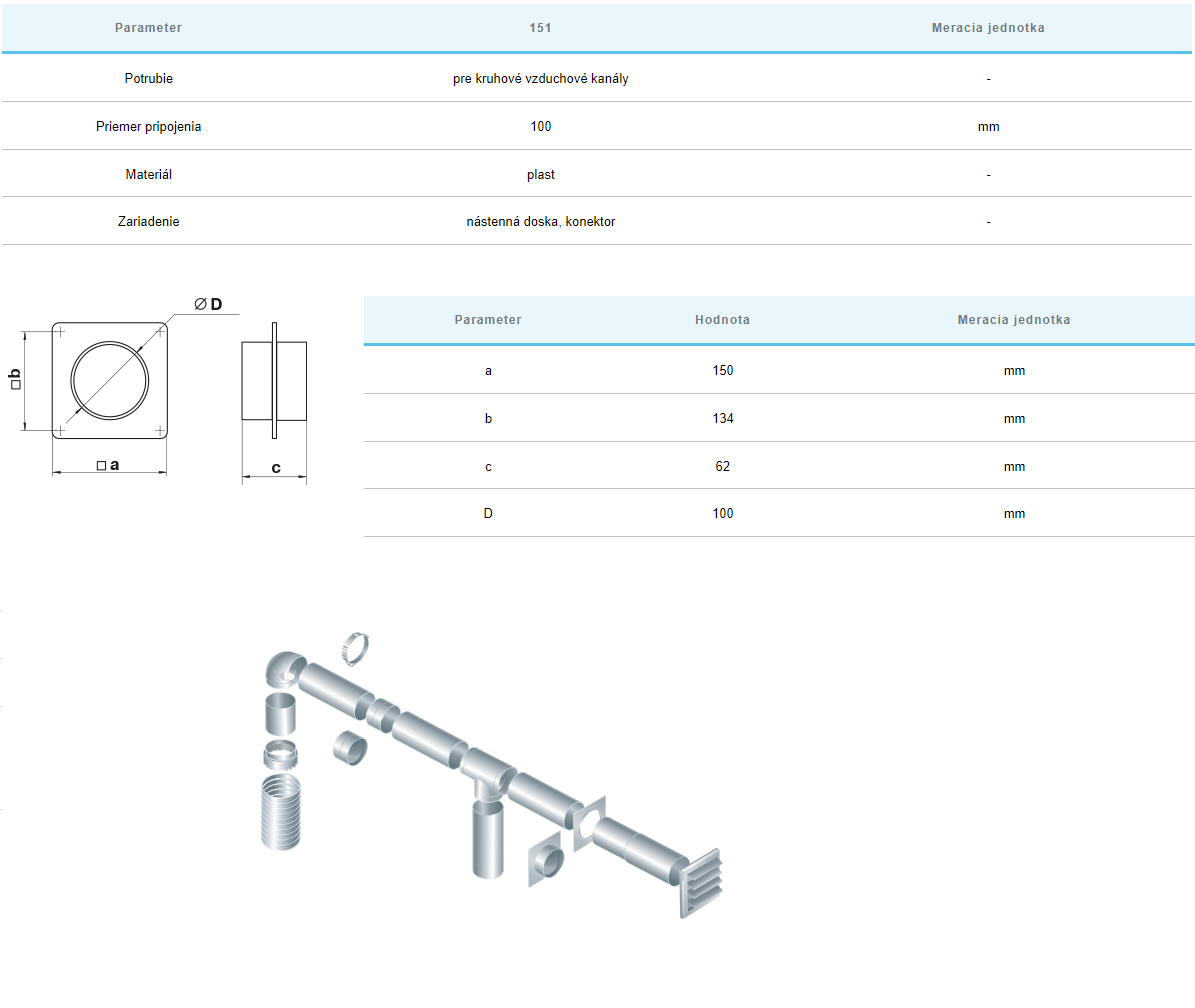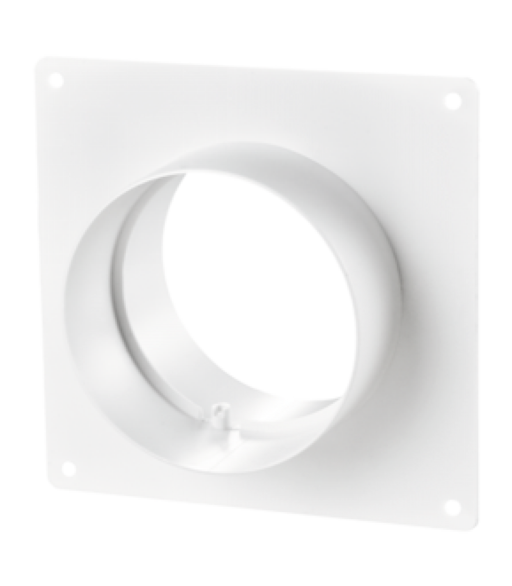 Spojka s prírubou kód 151 pre plastové potrubia Ø100mm. Táto spojka sa vsúva do potrubia Ø100mm a slúži na pripojenie vzduchových potrubí rovnakého priemeru. Je vyrobená z bieleho plastu a dekoruje montážne otvory. Vybavená nástennou doskou na ozdobu montážnych otvorov.