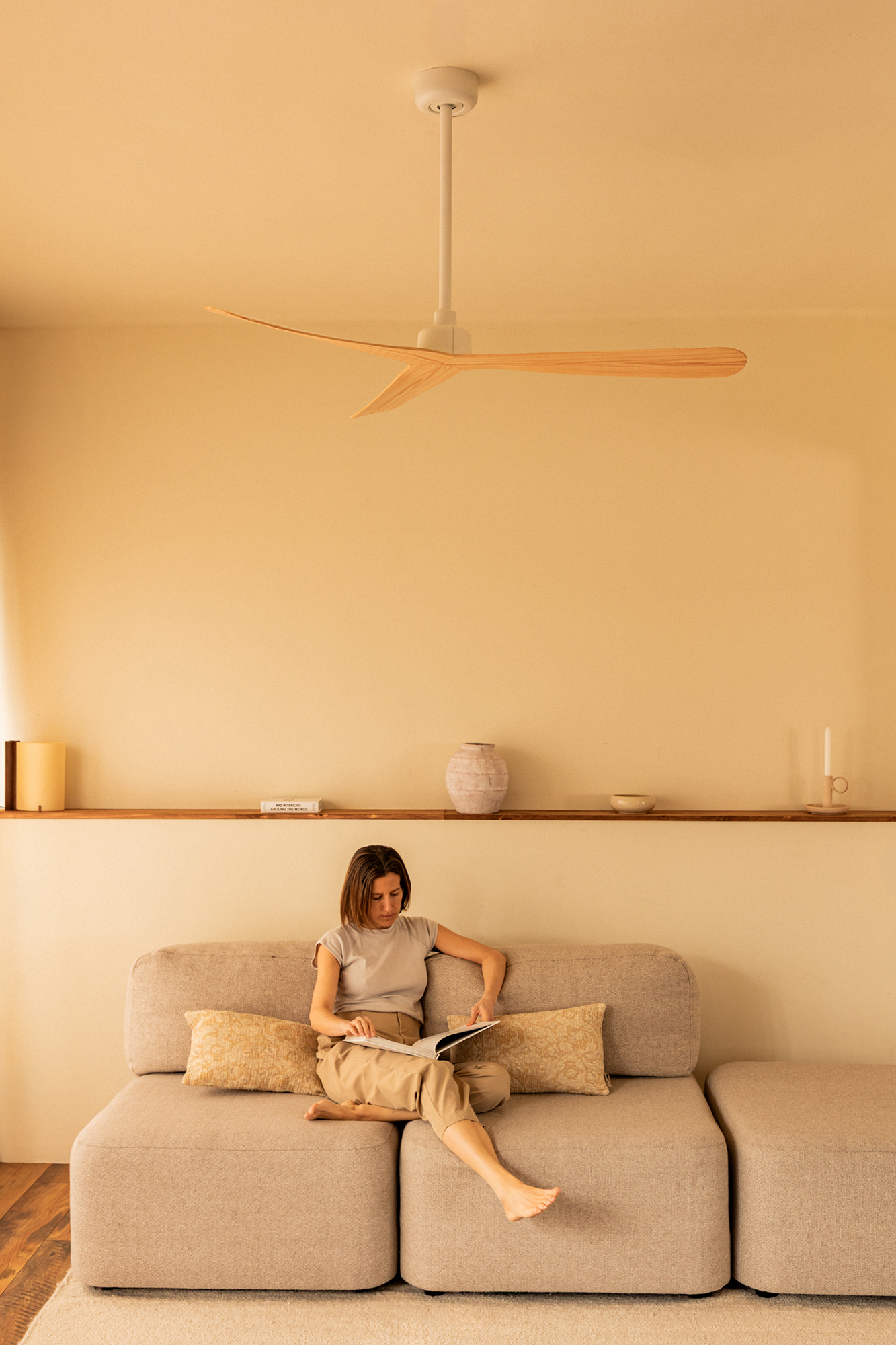 Stropný ventilátor ROCKER M biely/jaseňový Ø1320MM s diaľkovým ovládačom.Rocker je stropný ventilátor s povrchovou úpravou jaseňového dreva, veľkosti M. Je vybavený jednosmerným motorom, ponúka 6 nastaviteľných rýchlostí, má funkciu spätného chodu a je vhodný pre šikmé stropy.