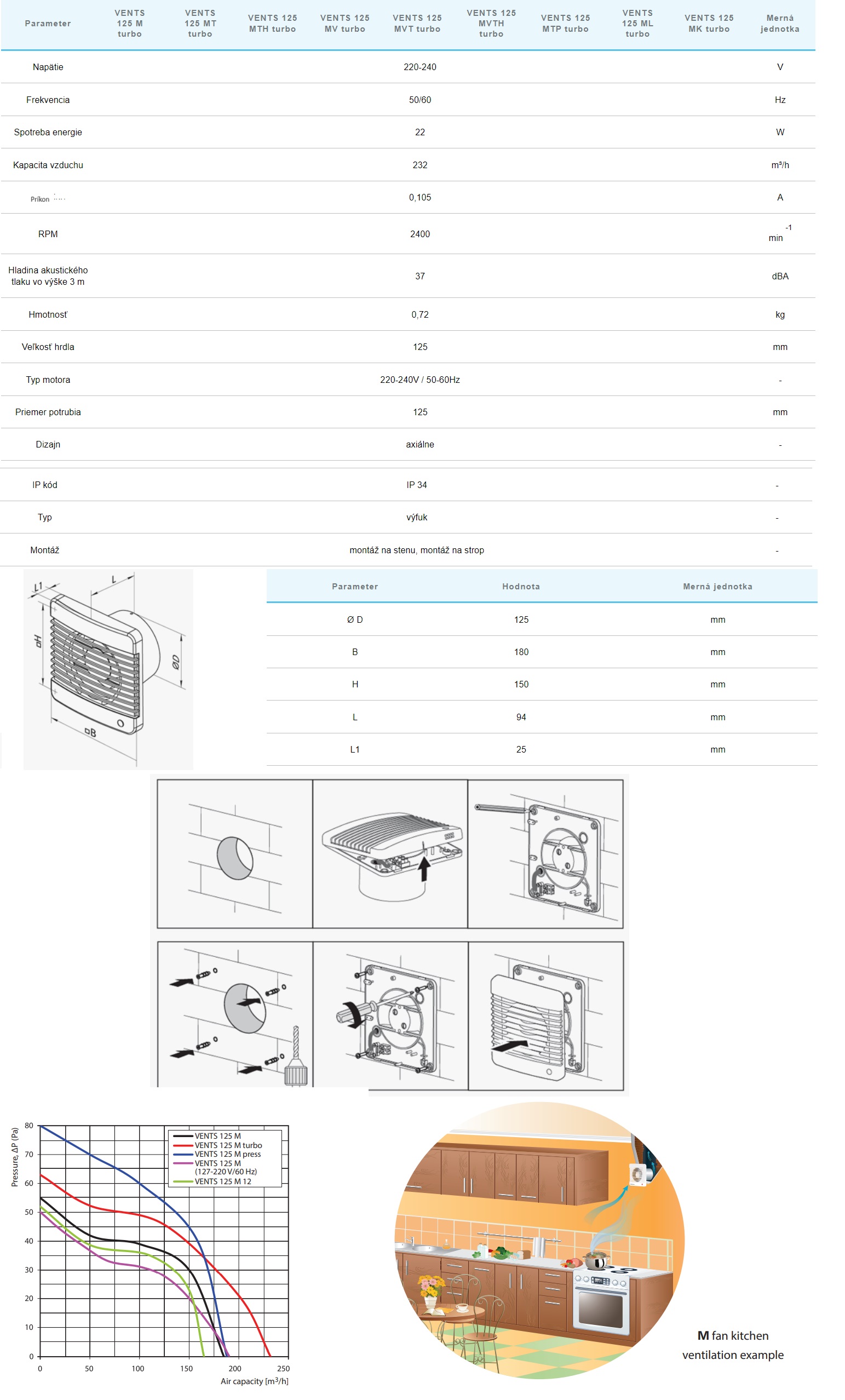 Výbava:Pre potrubie 125 mm-T Ventilátor je vybavený časovačom. Po vypnutí vypínača ventilátor pokračuje v činnosti v lehote od 2 až do 30 minút v závislosti na nastavení časovača. Časovač /timer/ sa nastavuje otáčaním potenciometra v smere hodinových ručičiek pre zvýšenie a proti smeru hodinových ručičiek pre jej zníženie. TURBO zvýšený výkon.