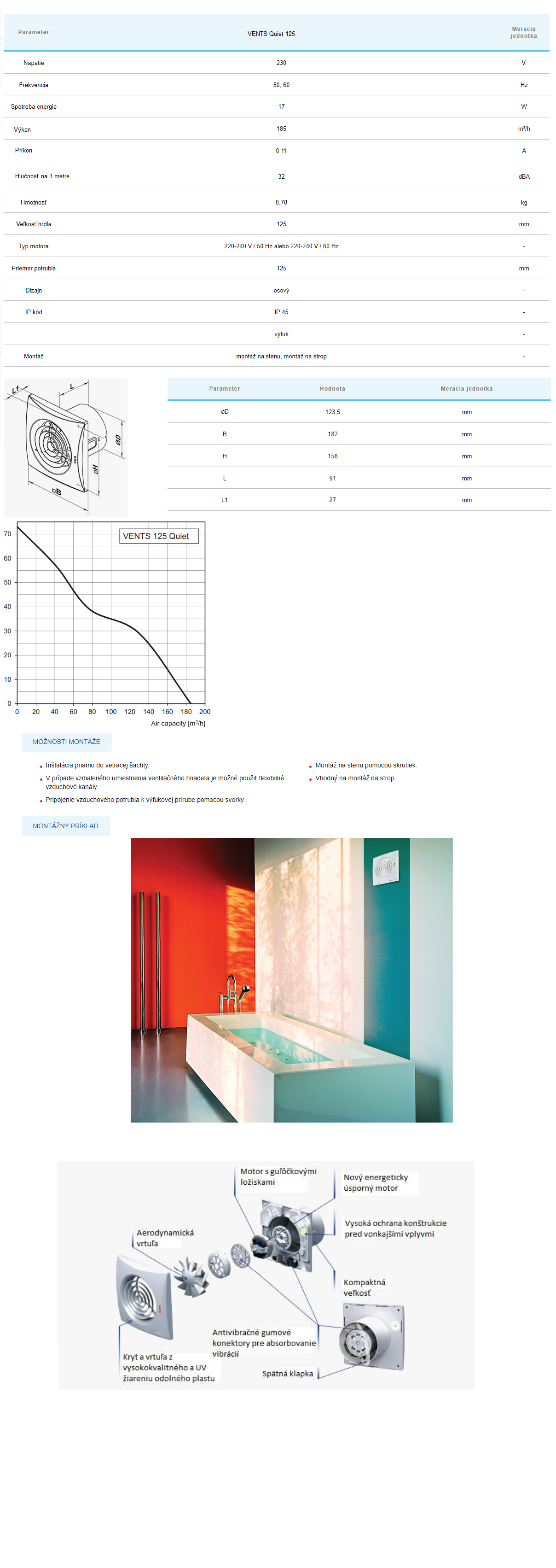 Zapínanie vypínačom na svetlo. Použitie inovatívneho odťahového ventilátora s elegantným dizajnom zvyšuje pohodlie v sprchách, kúpeľniach, kuchyniach a ďalších obytných priestoroch. Maximálna kapacita v kombinácii s nízkou hladinou hluku zabezpečuje ideálnu mikroklímu. Montáž je možná do vetracej šachty alebo pripojením na potrubie Ø125 mm. Dizajn skriňe a obežného kolesa je vyrobený z kvalitného a odolného plastu, ktorý sa hodí do akéhokoľvek interiéru. Špeciálne navrhnutý aerodynamický profil poskytuje vysokú vzdušnú kapacitu a nízku hlučnosť. Kompaktný dizajn umožňuje montáž na stenu a do stropu. Skrátený nástavec (81 mm) je určený pre montáž do vetracej šachty alebo pripojenie k potrubiu Ø125 mm. Ventilátor je vybavený špeciálnym spätným ventilom, ktorý zabraňuje spätnému toku a tepelnej strate v pohotovostnom režime. Obsahuje výfukový nástavec, ktorý znižuje turbulenciu, zvyšuje tlak vzduchu a znižuje úroveň hluku. Vysoké krytie IP 45 zabezpečuje, že ventilátor je ideálnym riešením pre vetranie kúpeľne. Elektronické komponenty sú chránené pevnými krytmi: Motor s nízkou spotrebou energie 17 W. Bezúdržbové ložiská obsahujú dostatok tuku na 40 000 hodín prevádzky. Motor je umiestnený na špeciálnych antivibračných tlmičoch, ktoré pohlcujú hluk a zabezpečujú tichú prevádzku. Motor je tiež vybavený ochranou proti prehriatiu.
