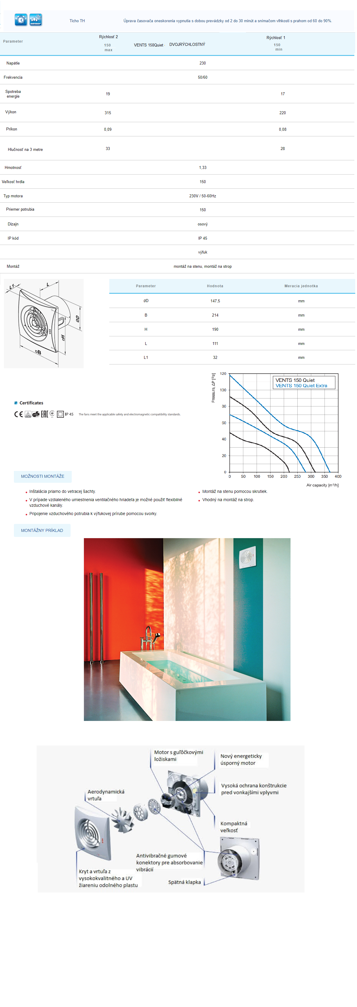 Kód: 2289 VENTS- Ventilátory-IP ochrana:Bezpečnosť vo vlhkom prostredí : Mimo zón:60cm od vane/sprchy ostatné časti kúpeľne–IPx2 a viac, Zóna 2:do 60 cm od vane/sprchy–min. IPx4