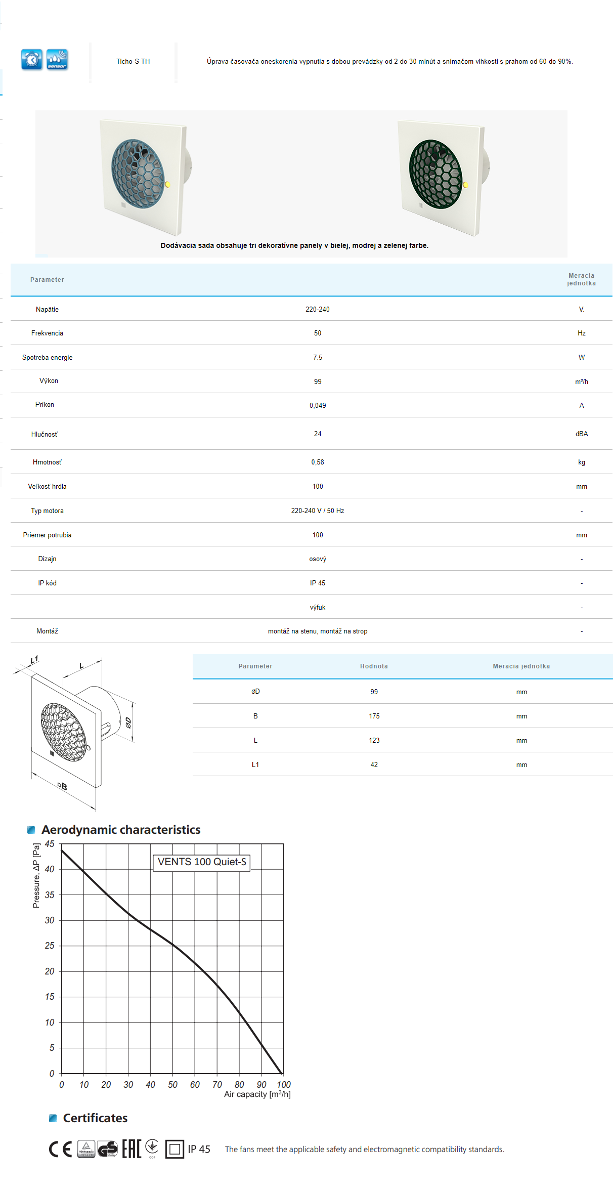 Ventilátor VENTS 100TH Quiet S je určený na odsávanie vzduchu z bytových a nebytových priestorov, ako sú kuchyne, kúpeľne, toalety, kancelárie, predajne a pod. Vzhľadom na svoje technické parametre je určený pre kratšie vzduchotechnické potrubia s nízkou tlakovou stratou, prípadne na odsávanie priamo cez stenu alebo na strop. Maximálna kapacita ventilátora v kombinácii s nízkou úrovňou hluku poskytuje optimálnu mikroklímu. Inštalácia je možná priamo do vetracieho otvoru. Pripojenie vzduchového potrubia k výfukovej prírube sa vykonáva pomocou svorky. Montáž na stenu sa realizuje pomocou skrutiek. Ventilátor je možné montovať do vetracích šácht alebo pripojiť na Ø 100 mm. Kryt a obežné koleso sú vyrobené z kvalitného a odolného plastu, odolného voči UV žiareniu. Špeciálne navrhnutý aerodynamický profil obežného kolesa zaisťuje vysokú kapacitu vzduchu a nízku hlučnosť. Kompaktná konštrukcia umožňuje montáž na stenu a na strop. Skrátená príchytka na montáž do vetracieho hriadeľa alebo na pripojenie k vzduchovým potrubiam Ø 100 mm. Ventilátor je vybavený špeciálne navrhnutým spätným ventilom, ktorý zabraňuje spätnému toku a tepelným stratám počas pohotovostného režimu. Výfuková klapka ventilátora obsahuje špeciálne vzduchové usmerňovače na zníženie turbulencie vzduchu, zvýšenie tlaku vzduchu a zníženie hladiny hluku. Vysoká ochrana proti vniknutiu zaručuje, že ventilátor je ideálnym riešením pre vetranie kúpeľne. Elektronické komponenty sú chránené pevnými krytmi.