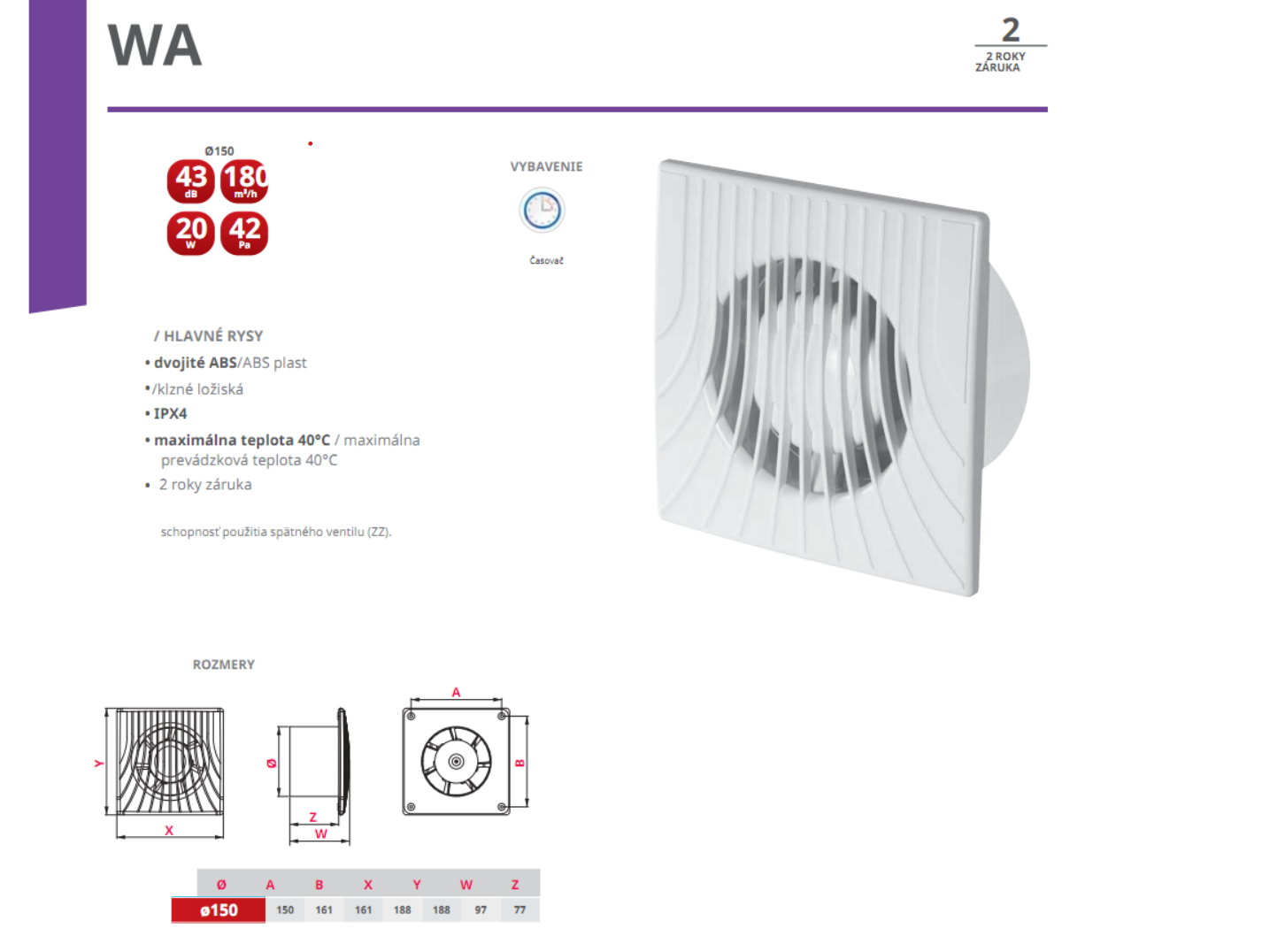 Ventilátor do kúpeľne AWENTA WA150 T s priemerom 150 mm a výkonom 180 m³/h je navrhnutý pre zákazníkov, ktorí hľadajú jednoduché a spoľahlivé riešenie. Tento ventilátor sa vyznačuje veľmi dobrými prevádzkovými parametrami a vysokou spoľahlivosťou.