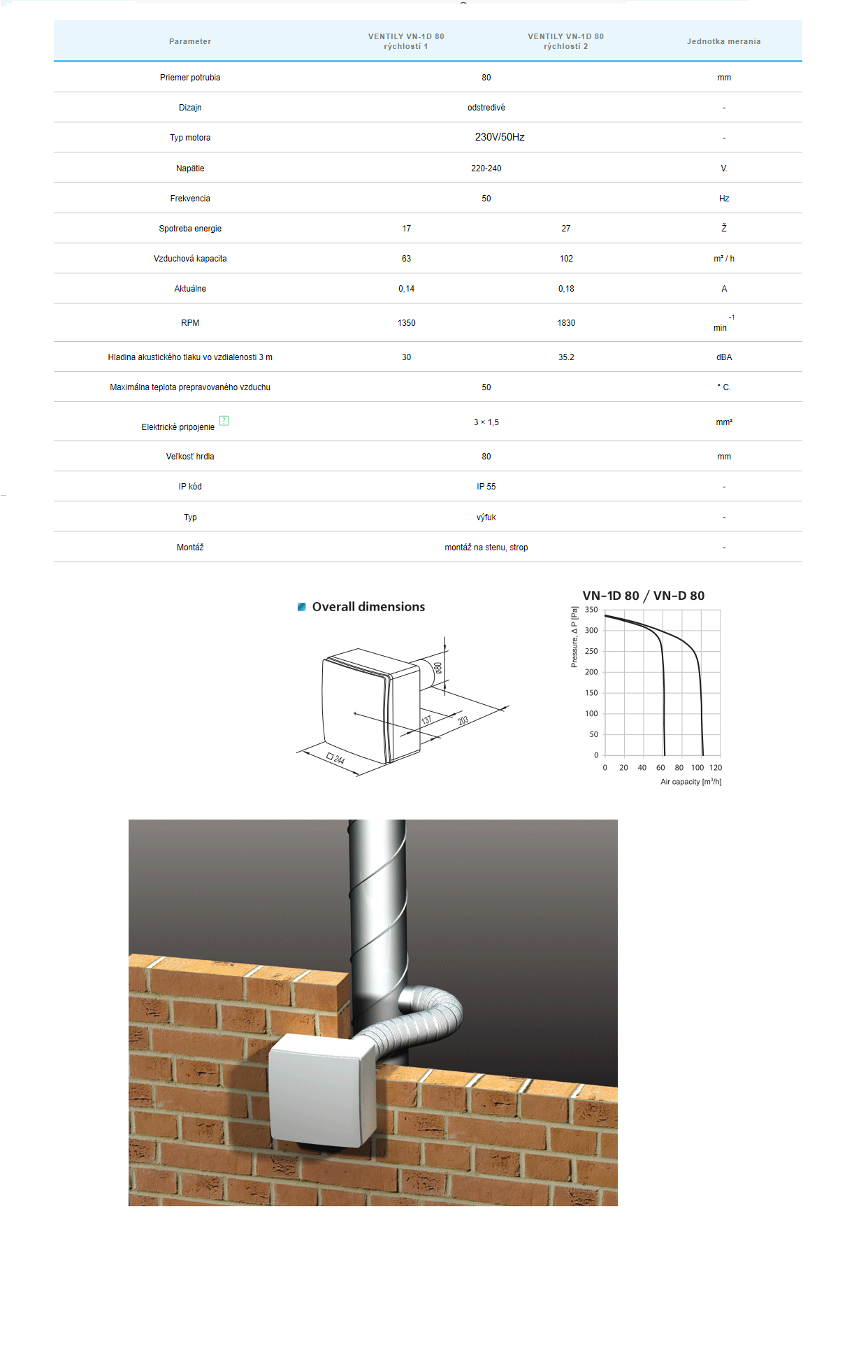 Ventilátor je určený na montáž na povrch. Predný panel a plášť sú vyrobené z vysoko kvalitného odolného plastu ABS. Vybavený plastovým tlmičom spätného ťahu. Pripojenie k hlavnej vetracej šachte sa realizuje pomocou pružného vzduchového potrubia s priemerom 80 mm.