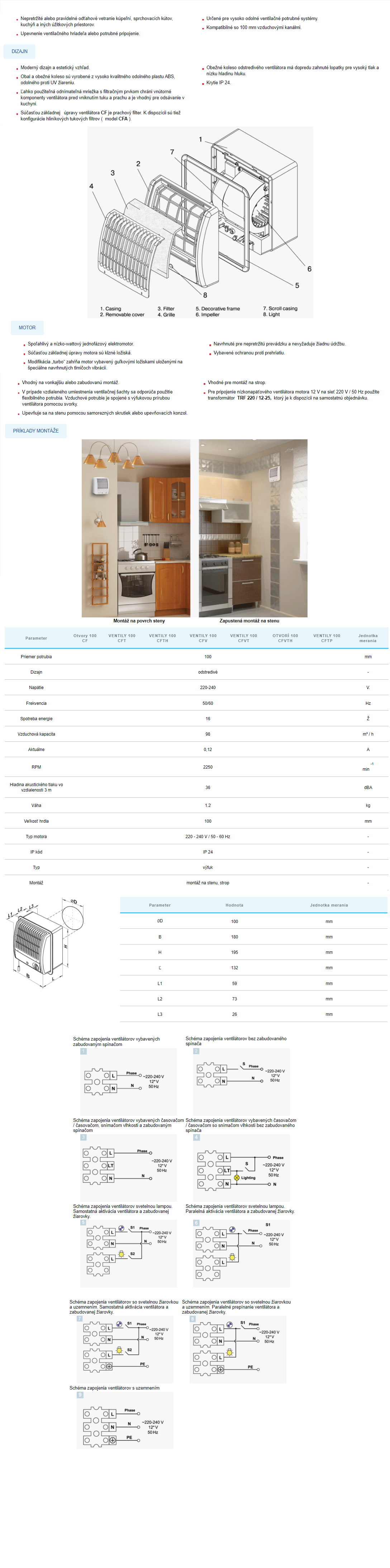 Radiálny ventilátor Vents 100CFT s priemerom 100mm a výkonom 98m3/h. Vybavený plastovou spätnou klapkou. Po vypnutí pokračuje v činnosti 2-30 minút.