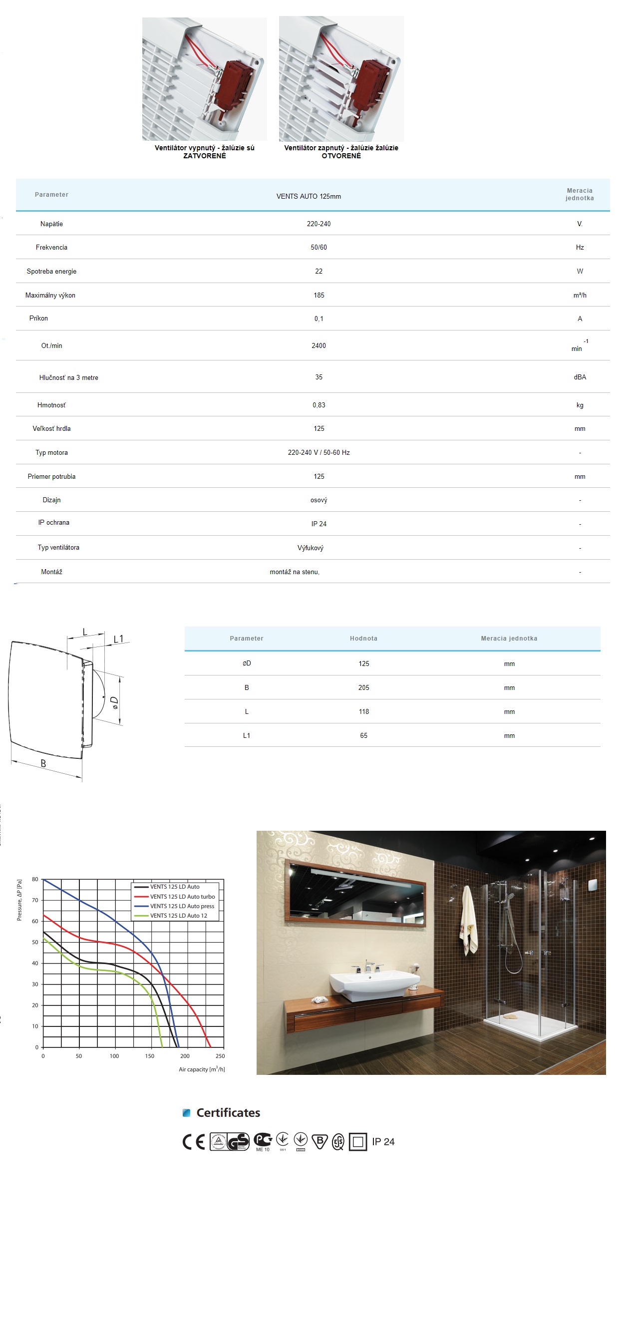 | Vlastnosti-výbava ventilátora | Automatická žaluzia, Parový /vlhkostný/senzor má automaticky časový dobeh |