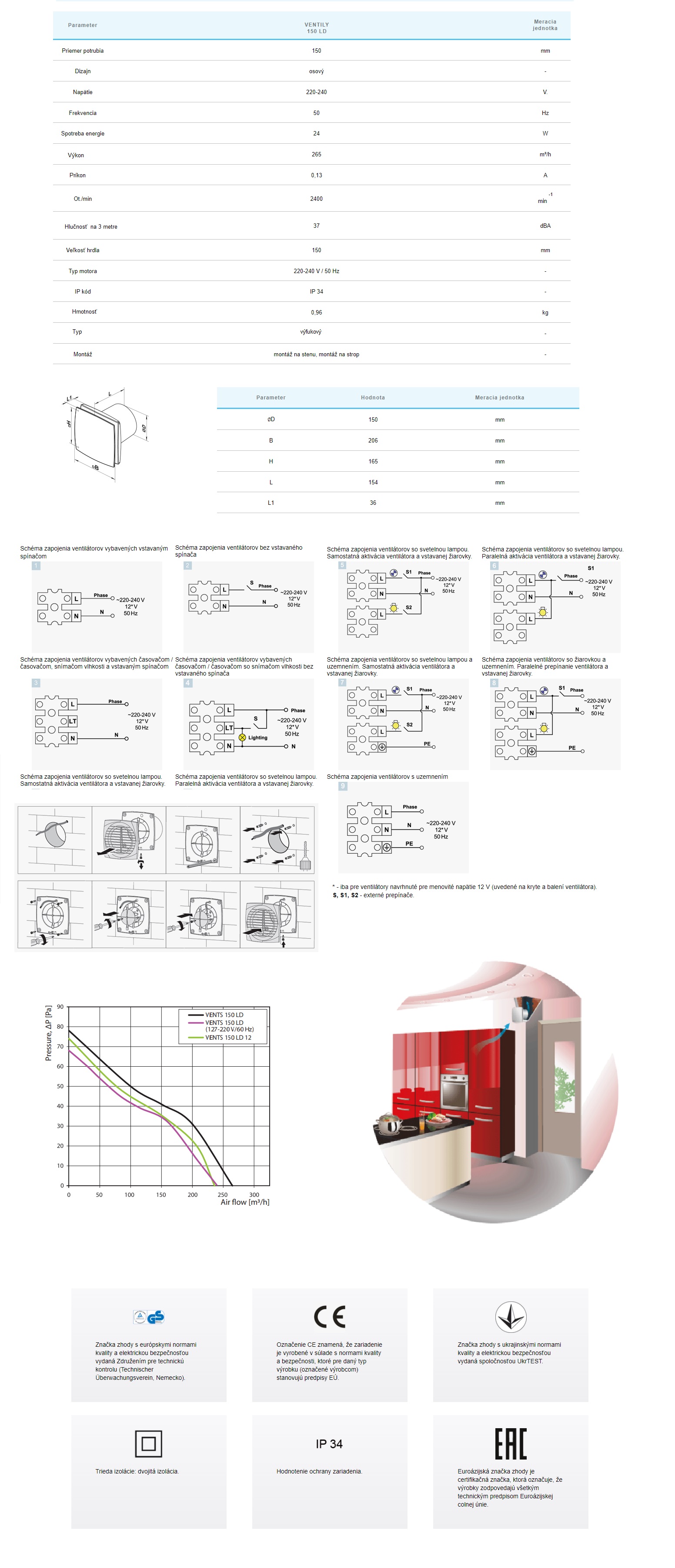 Ventilátor do kúpeľne a WC VENTS 150LDTH s priemerom 150 mm a výkonom 265 m³/h je ideálny pre kontinuálne alebo periodické odsávanie vzduchu v kúpeľniach, spŕch, kuchyniach a ďalších úžitkových priestoroch. Upevnenie ventilačného hriadeľa alebo pripojenie potrubia je jednoduché. Ventilátor zabezpečuje nízky až stredný pohyb vzduchu na krátke vzdialenosti s nízkym odporom vzduchu. Je kompatibilný so vzduchovými kanálmi Ø 150 mm.