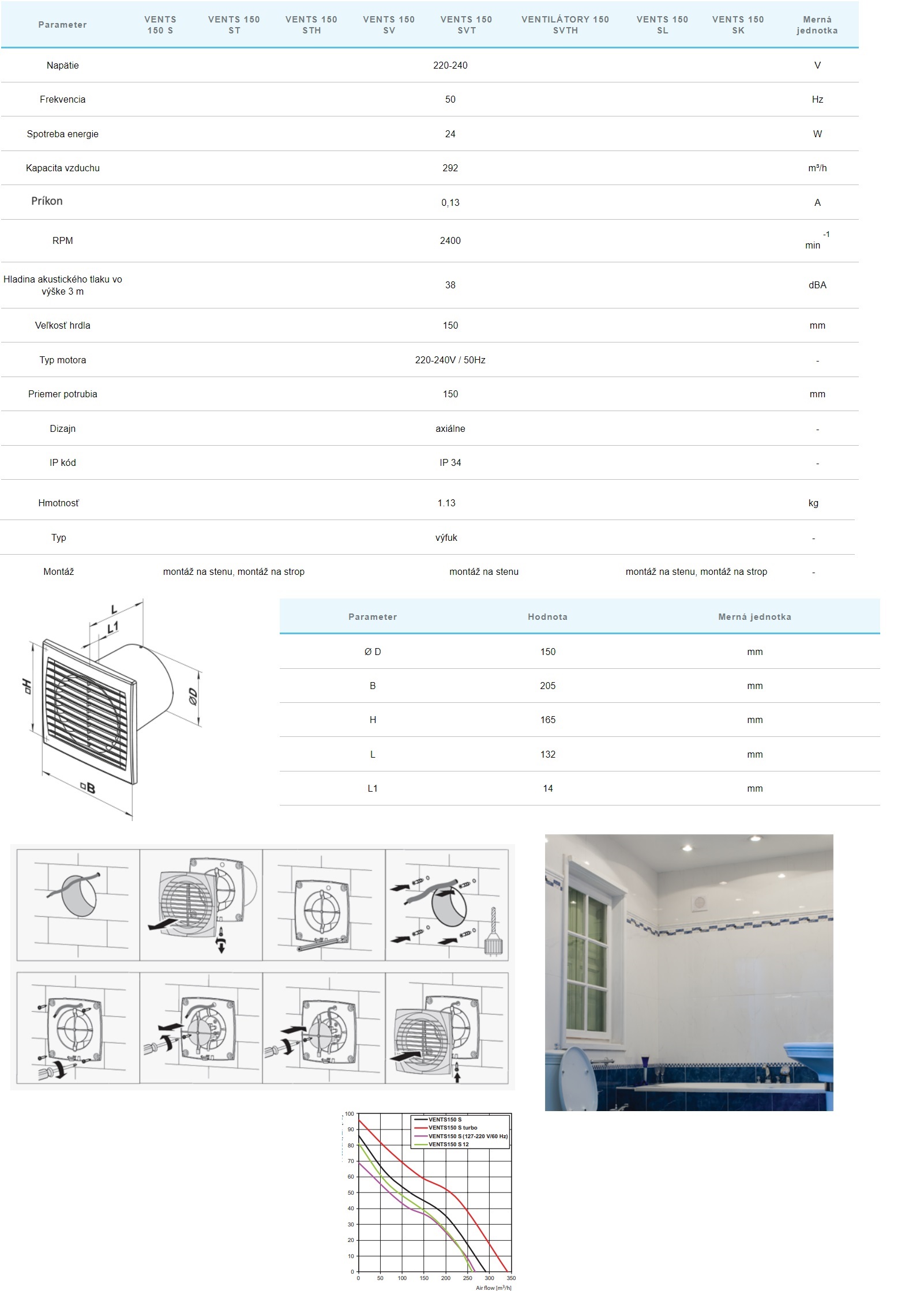 - Ventilátory do kúpeľne pre ⌀ potrubia : ⌀150mm-Filter zaradenia medzi výkon od 180-do 335m3/h
