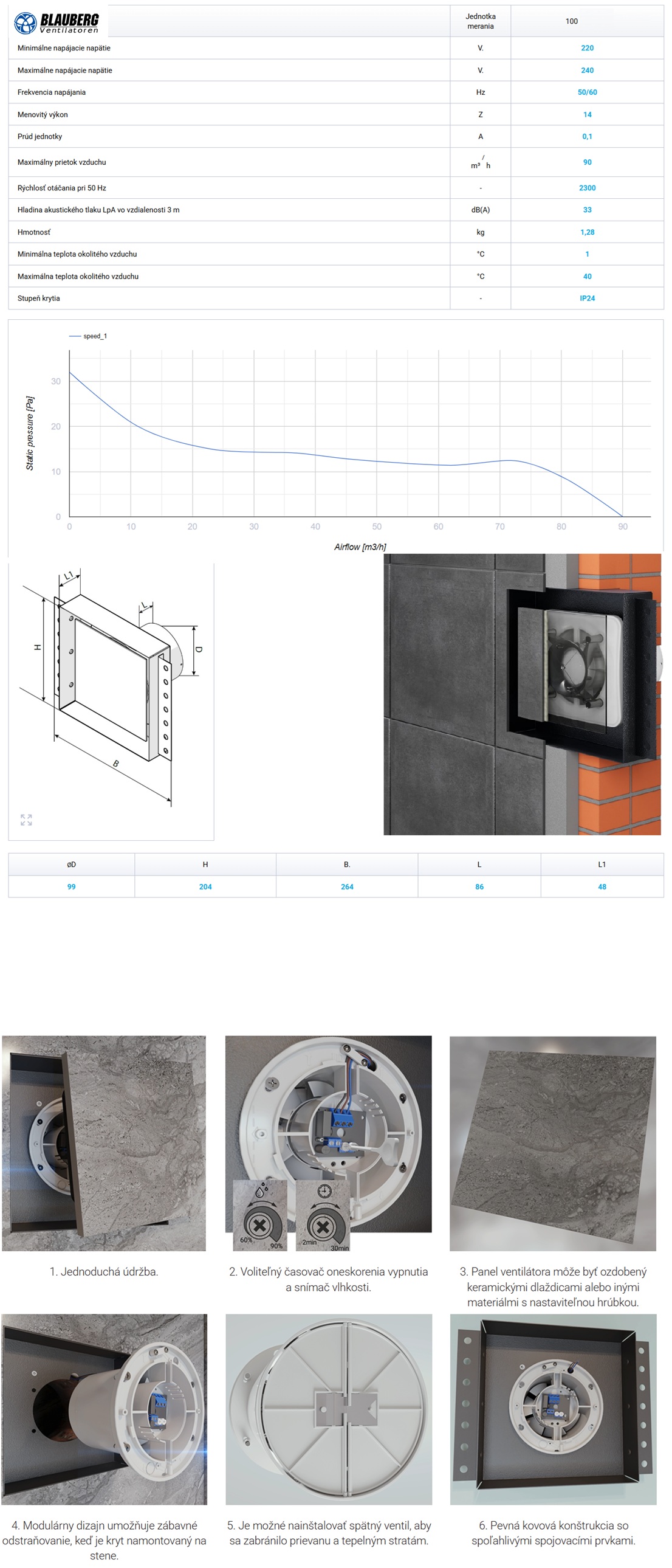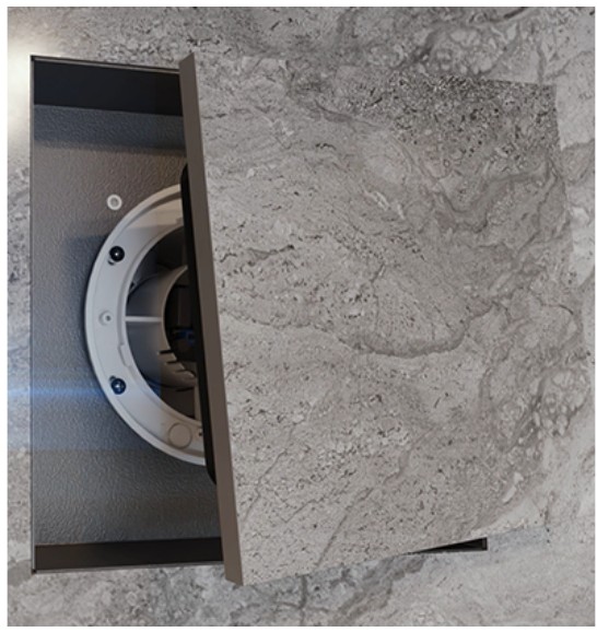 Ventilátor s priemerom 100 mm a výkonom 90 m³/h. Kryt ventilátora sa montuje zapustene do steny, pod keramické dlaždice alebo akýkoľvek iný dekoratívny kryt. Ventilátor sa inštaluje priamo do otvoru vetracej šachty. Ak je vetracia šachta umiestnená vzdialene, je možné použiť flexibilné vzduchové potrubia. Vzduchové potrubie je pripojené k výstupnej prírube ventilátora pomocou svorky. Predný panel je ukončený rovnakým krytom a zarovnaný so stenou. Presun nízkych a stredných prúdov vzduchu na krátke vzdialenosti pomocou vetracích systémov s nízkym odporom. Inštalácia s potrubiami s priemerom vzduchu Ø 100 mm. Ventilátor má kovový kryt pre spoľahlivú montáž. Zvyšok prvkov je vyrobený z vysoko kvalitného a odolného ABS plastu. Na prednú odnímateľnú časť sa lepí obklad o rozmere maximálne 17×17 cm.